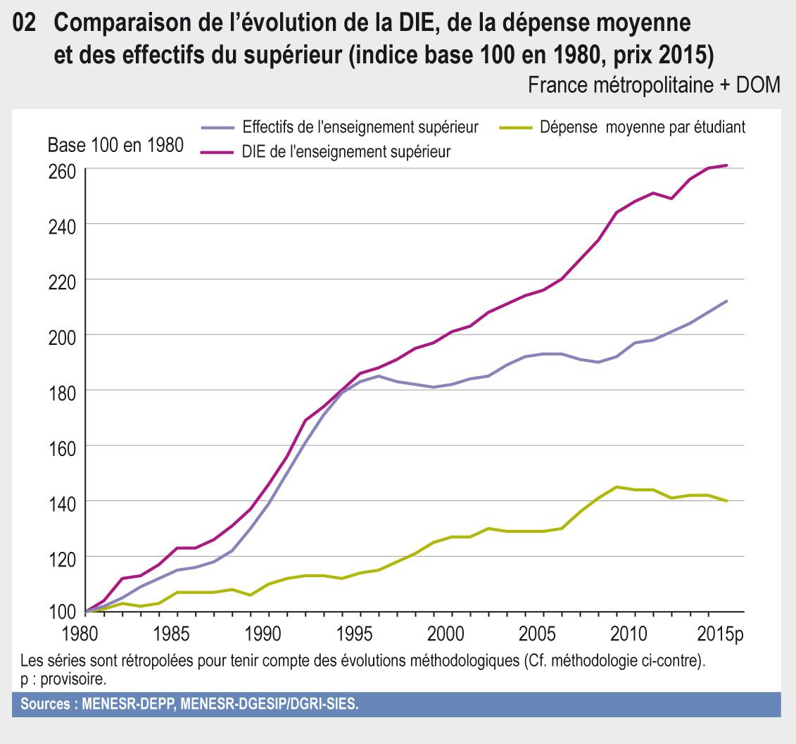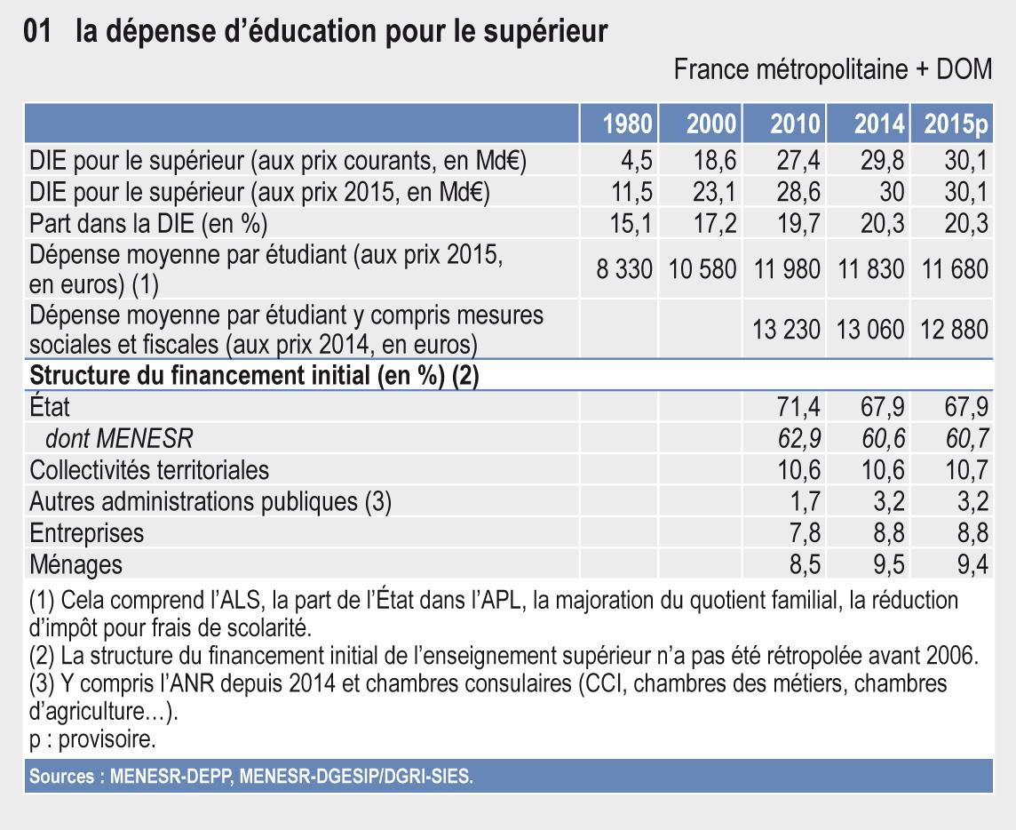 En 2015, la collectivité nationale (État, collectivités territoriales, autres administrations publiques, ménages et entreprises) a consacré 30,1 milliards d'euros (Md€) à l'enseignement supérieur, soit une hausse de 0,2 % par rapport à 2014 (en prix constants). Depuis 1980, la dépense pour l'enseignement supérieur a connu une forte croissance, de 2,7 % en moyenne annuelle. Son poids dans la dépense intérieure d'éducation (DIE) est passé de 15,1 % en 1980 à 20,3 % en 2015 (tableau 01.01).