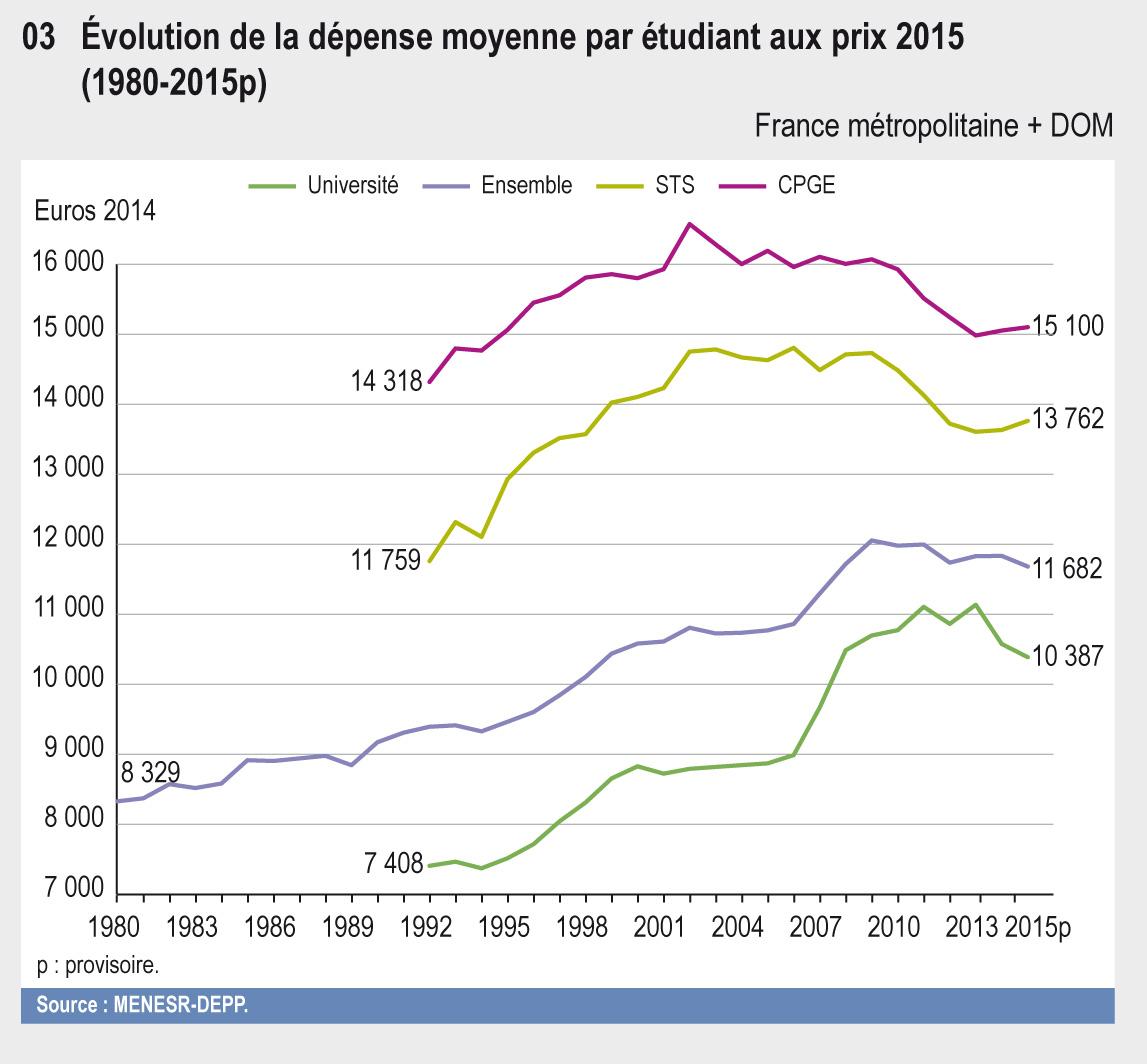 La collectivité nationale a consacré 30,1 milliards d'euros (Md€) à l'enseignement supérieur en 2015. C'est 2,6 fois plus qu'en 1980 (en euros constants). L'État y participe pour 67,9 %. En 2015, la dépense moyenne par étudiant s'élève à 11 680 euros, soit 40 % de plus qu'en 1980 (en euros constants).