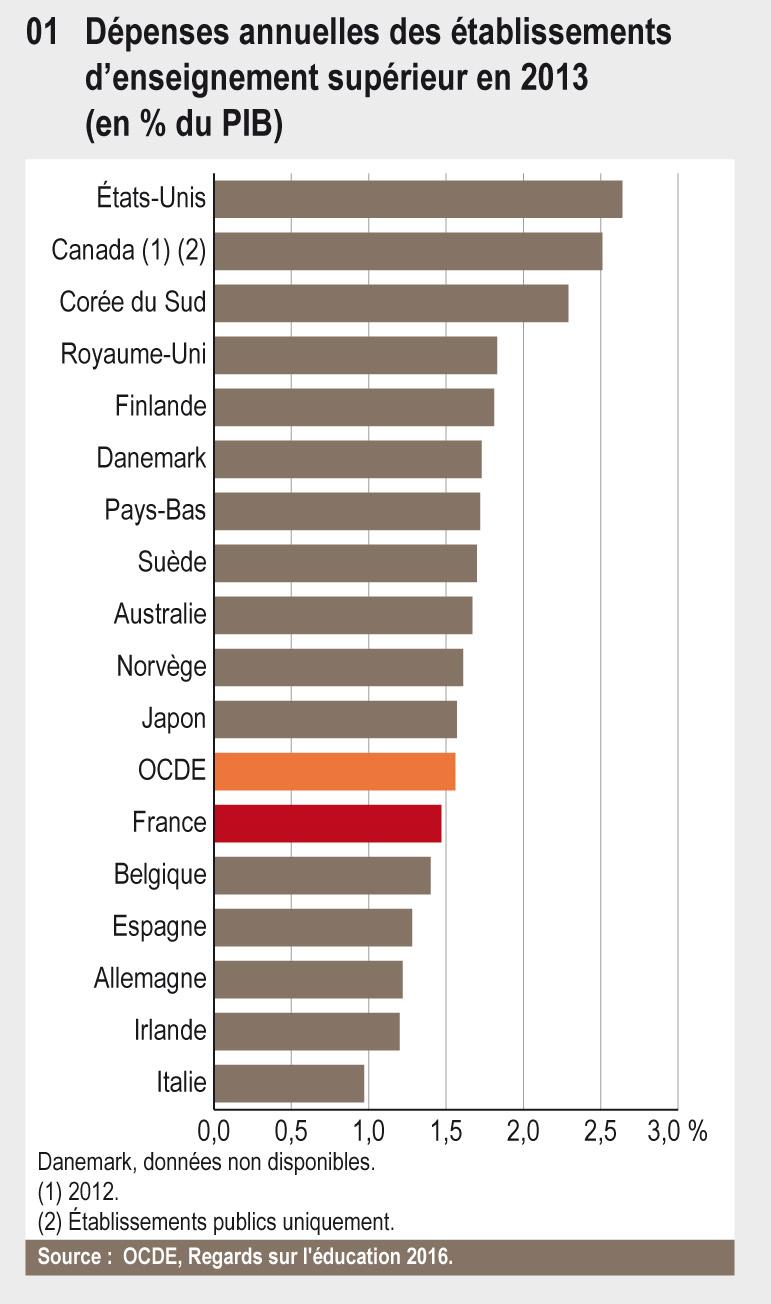Le poids de la dépense d’éducation en pourcentage du Produit Intérieur Brut (PIB) est l’indicateur qui permet d’évaluer, de la façon la plus globale, l’effort concrètement consenti par l’ensemble des financeurs en faveur des systèmes éducatifs nationaux (graphique 02.01). Avec 1,5 % du PIB consacré en 2013 à l’enseignement supérieur, la France se situe à un niveau proche de la moyenne des pays de l’OCDE (1,6 %). Elle devance des pays européens comme l’Espagne (1,3 %), l’Allemagne (1,2 %) ou l’Italie (1,0 %) mais est distancée par le Royaume-Uni (1,8 %), la Finlande (1,8 %) et les Pays-Bas (1,7 %). Trois pays réalisent un effort financier pour l’enseignement supérieur très au-dessus de la moyenne : les États-Unis (2,6 %), le Canada (2,5 % en 2012) et la Corée du Sud (2,3 %).