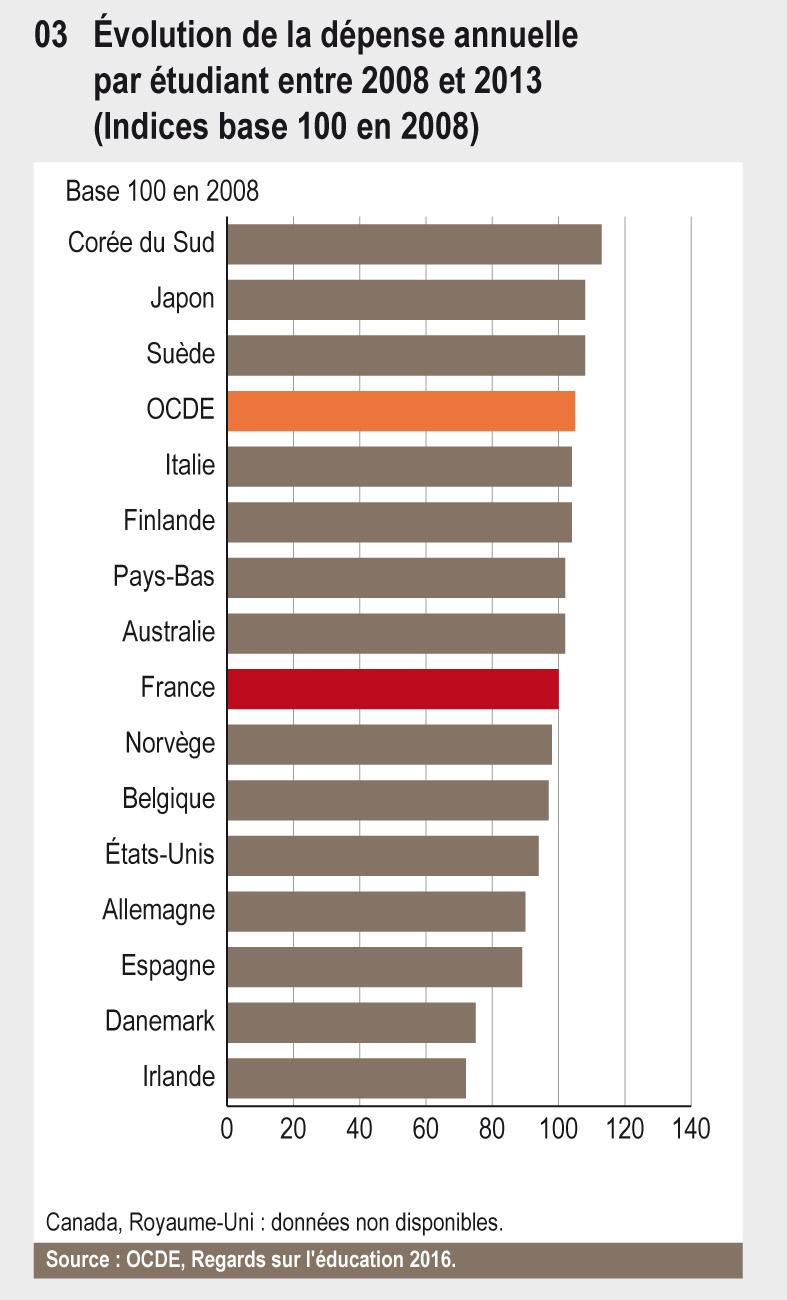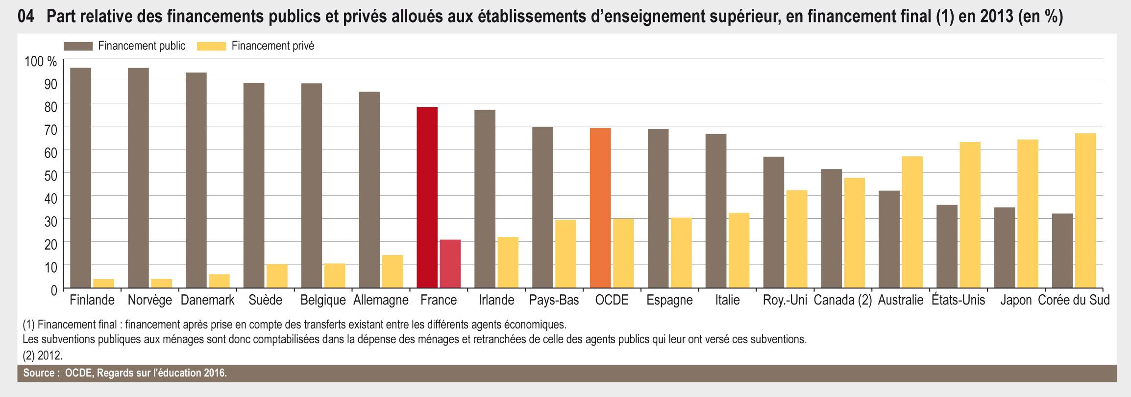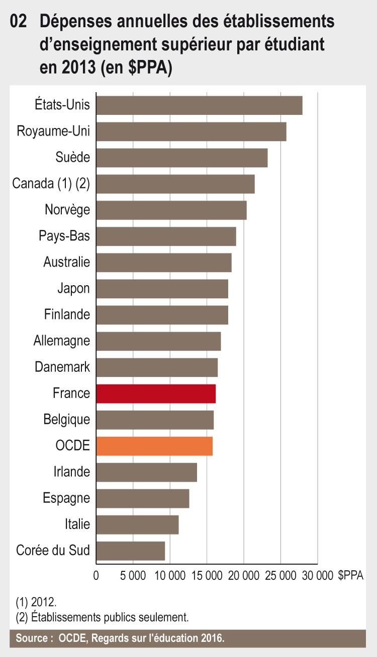 En 2013, la dépense moyenne par étudiant en France est proche de la moyenne des pays de l’OCDE. Elle se stabilise ces dernières années après une forte hausse observée entre 2005 et 2008. Cependant, l’effort national consacré à l’enseignement supérieur reste légèrement en dessous de la moyenne des pays de l’OCDE (1,5 % du PIB contre 1,6 %).