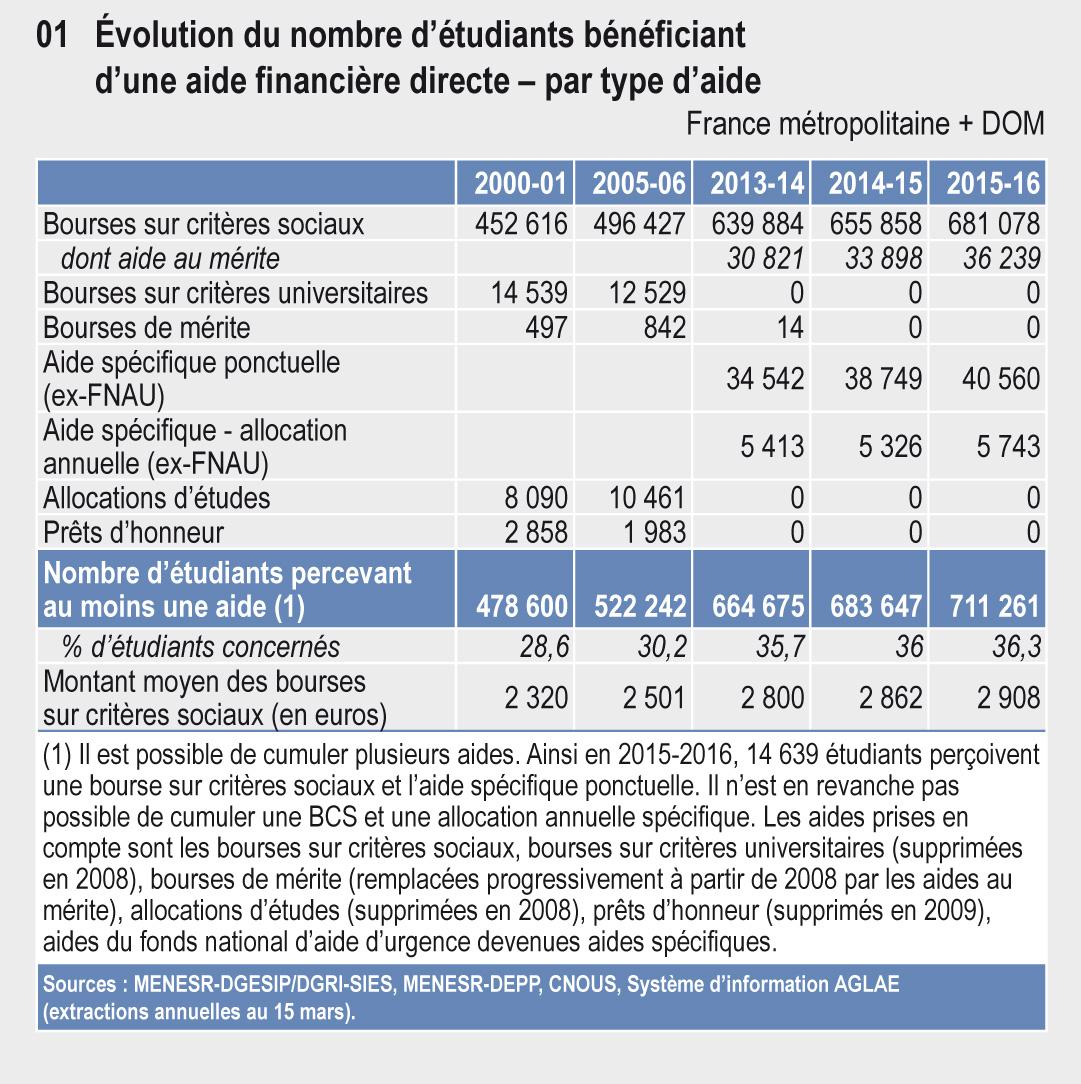 1 Il est possible de cumuler plusieurs aides. Ainsi en 2015-2016, 14 639 étudiants perçoivent une bourse sur critères sociaux et l'aide spécifique ponctuelle. Il n'est en revanche pas possible de cumuler une BCS et une allocation annuelle spécifique. Les aides prises en compte sont les bourses sur critères sociaux, bourses sur critères universitaires (supprimées en 2008), bourses de mérite (remplacées progressivement à partir de 2008 par les aides au mérite), allocations d’études (supprimées en 2008), prêts d’honneur (supprimés en 2009), aides du fonds national d’aide d’urgence devenues aides spécifiques.