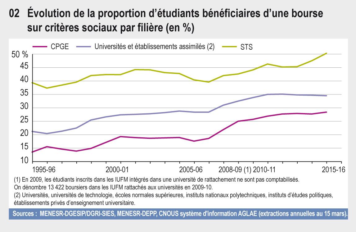03.02 Évolution de la proportion d'étudiants bénéficiaires d'une bourse sur critères sociaux par filière (en %)