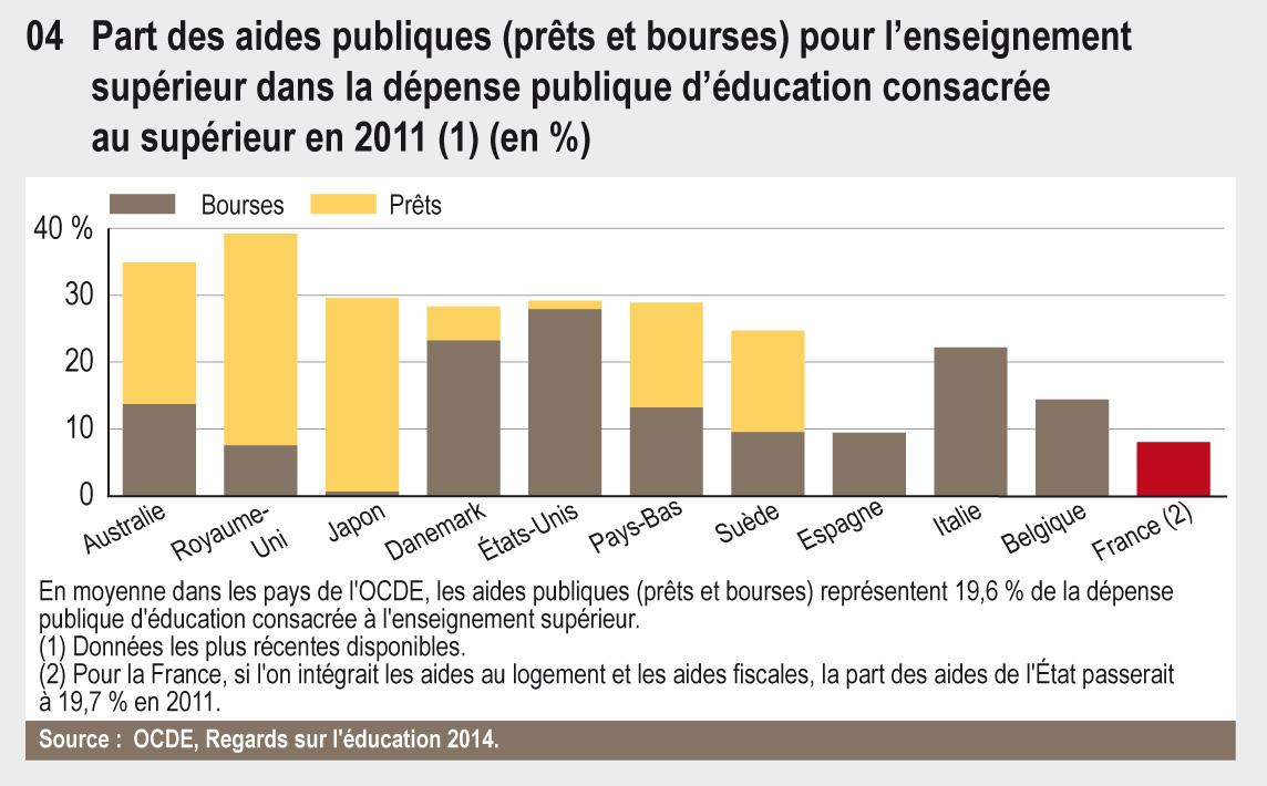 En moyenne dans les pays de l'OCDE, les aides publiques (prêts et bourses) représentent 19,6 % de la dépense publique d'éducation consacrée à l'enseignement supérieur.