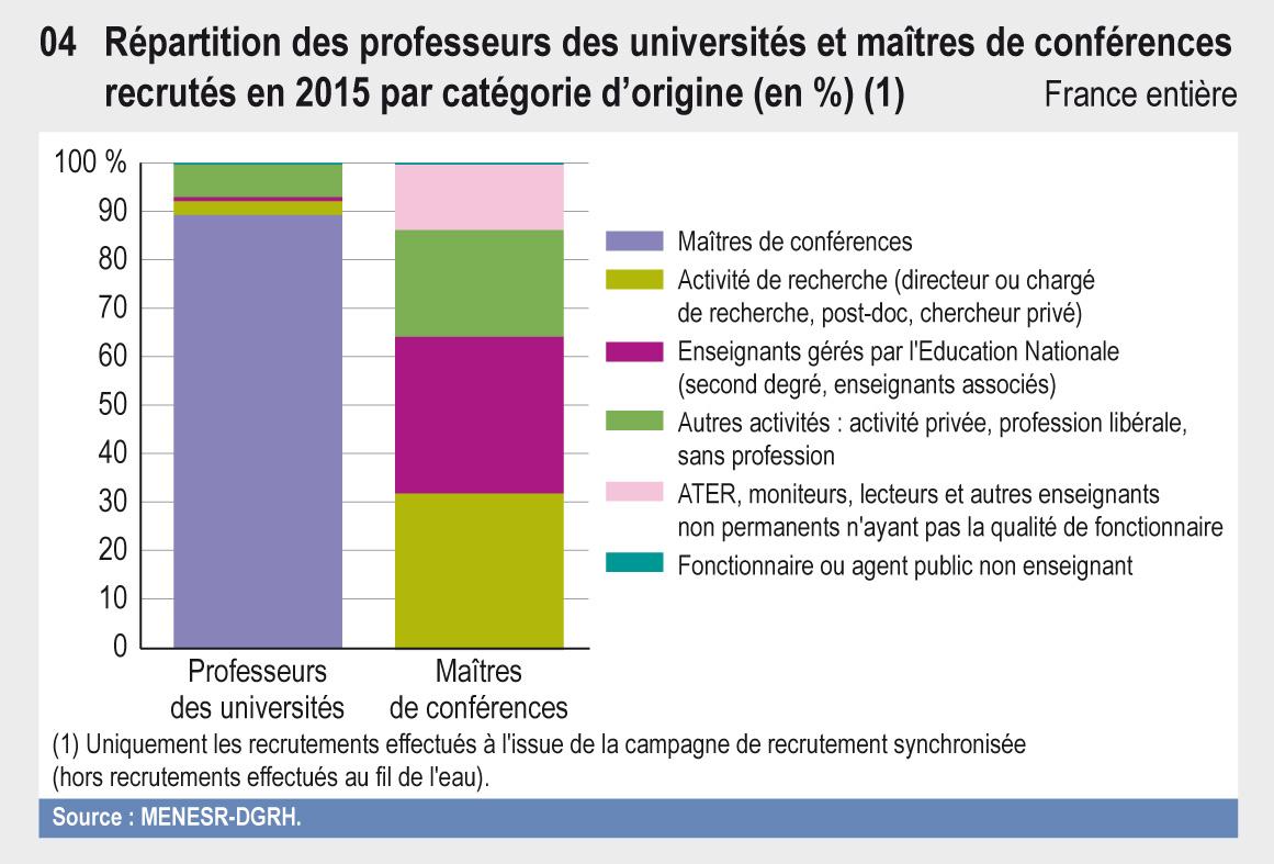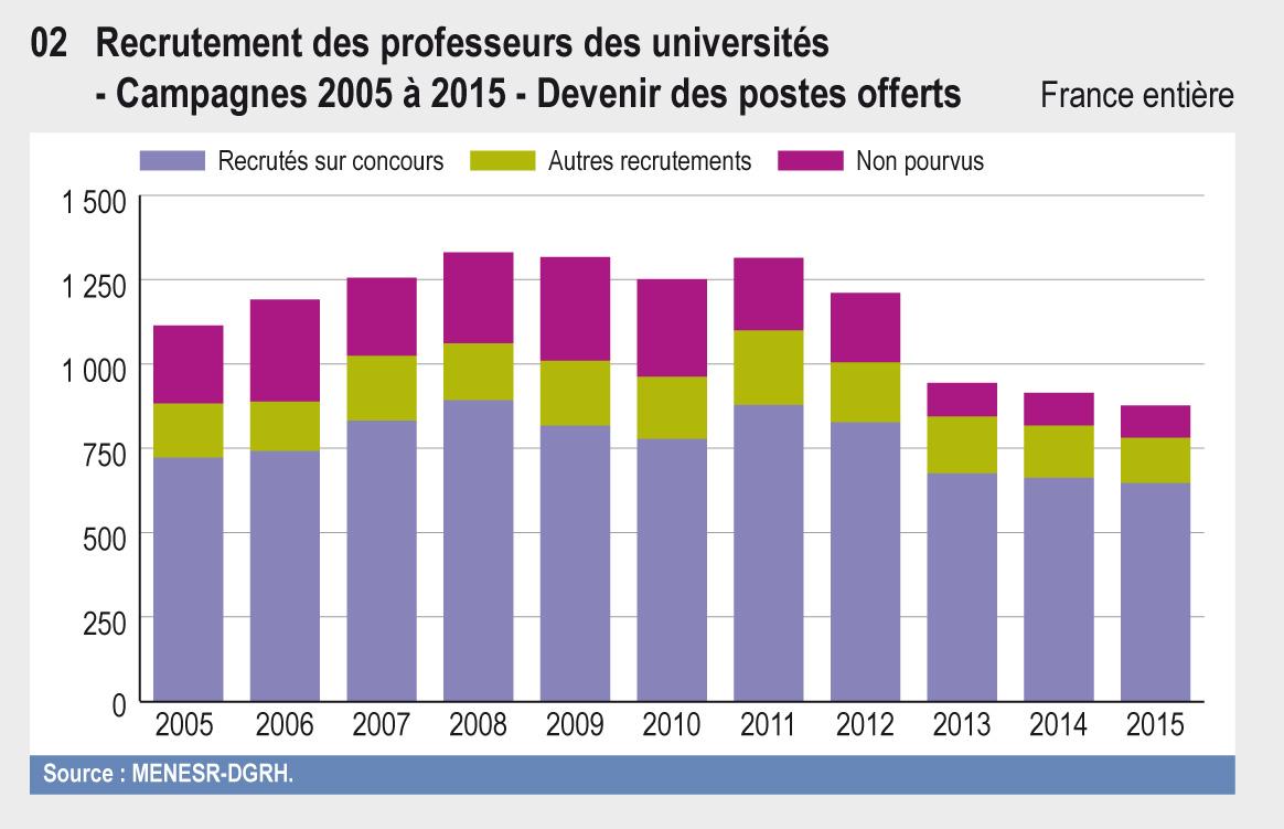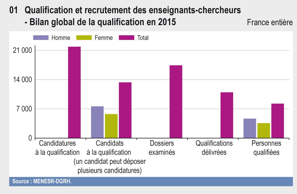 En 2015, 10 956 qualifications ont été délivrées à 8 243 qualifiés. 2 037 enseignants-chercheurs ont été recrutés dans les corps de professeurs des universités et de maîtres de conférences. Environ 44 % des maîtres de conférences recrutés sont des qualifiés de l’année et 46% pour les professeurs. La part des étrangers recrutés dans le corps des maîtres de conférences est stable à environ 15 %. L’endorecrutement représente 20 % chez les maîtres de conférences et 44 % chez les professeurs des universités.