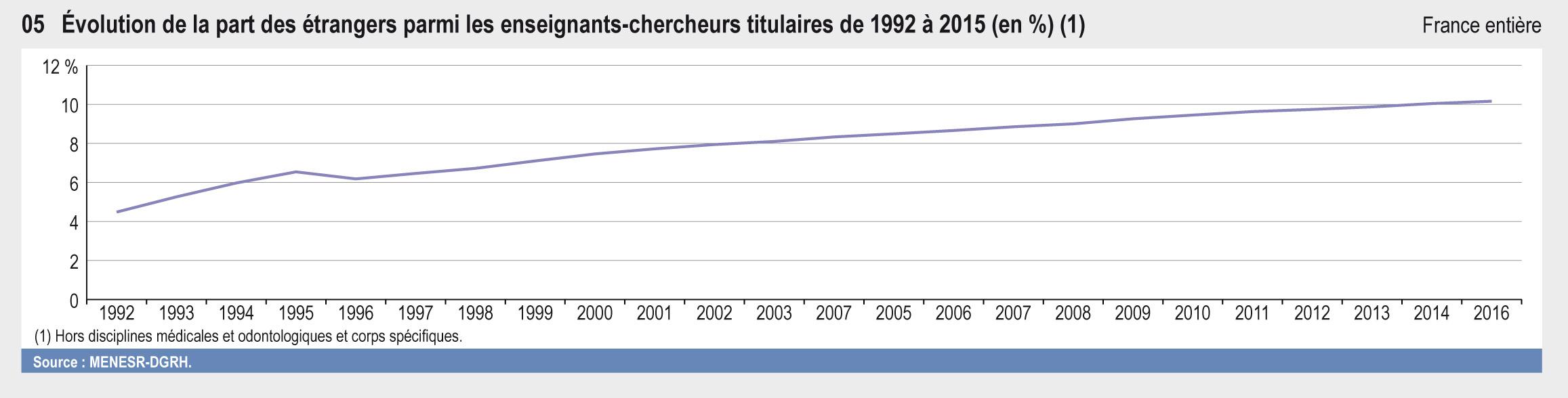 06.05 Évolution de la part des étrangers parmi les enseignants-chercheurs titulaires de 1992 à 2015 (en %) 1