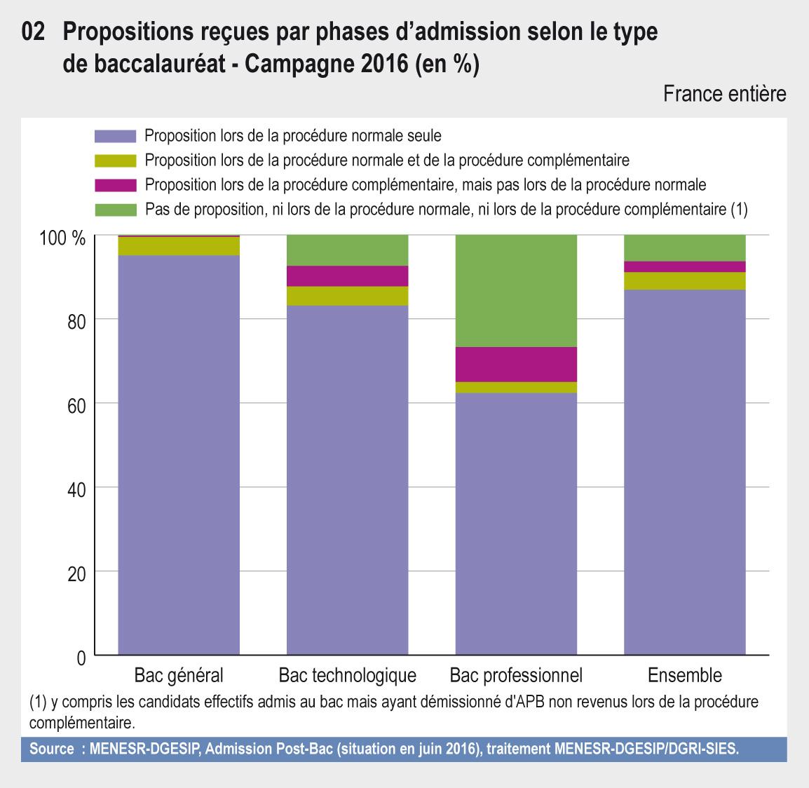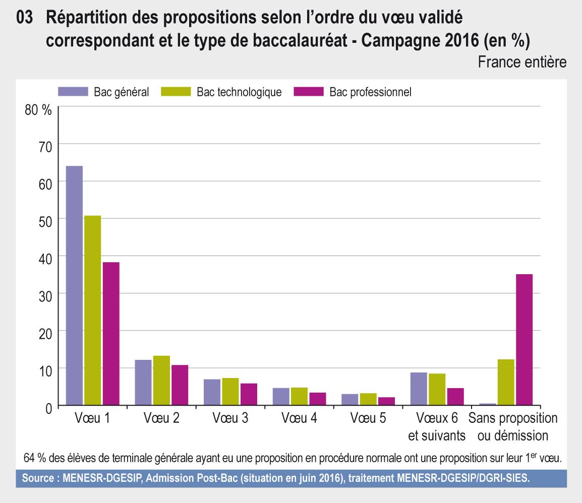 En 2016, 533 600 nouveaux bacheliers sont passés par le portail Admission post-Bac (APB) pour leur poursuite d’études. En moyenne, ils ont formulé 7,6 vœux. 87 % des candidats ont eu une proposition en procédure normale dont plus des deux tiers dans leur premier ou deuxième vœu.