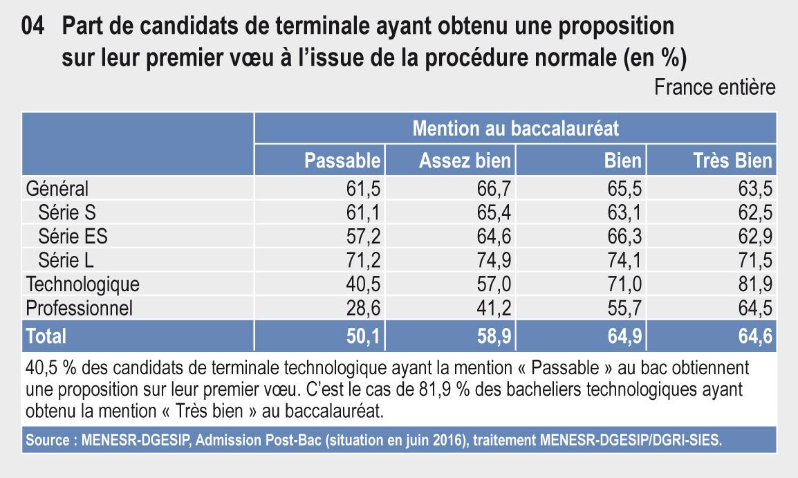 Les bacheliers professionnels ayant une mention « Passable » au baccalauréat sont 29 % à avoir une proposition sur leur premier vœu (tableau 08.04) mais 65 % de ceux obtenant une mention « Très bien » (56 % pour la mention « Bien ») au bac obtiennent leur vœu numéro 1. De même 82 % des bacheliers technologiques avec mention « Très bien » ont leur premier vœu (- 4 points).
