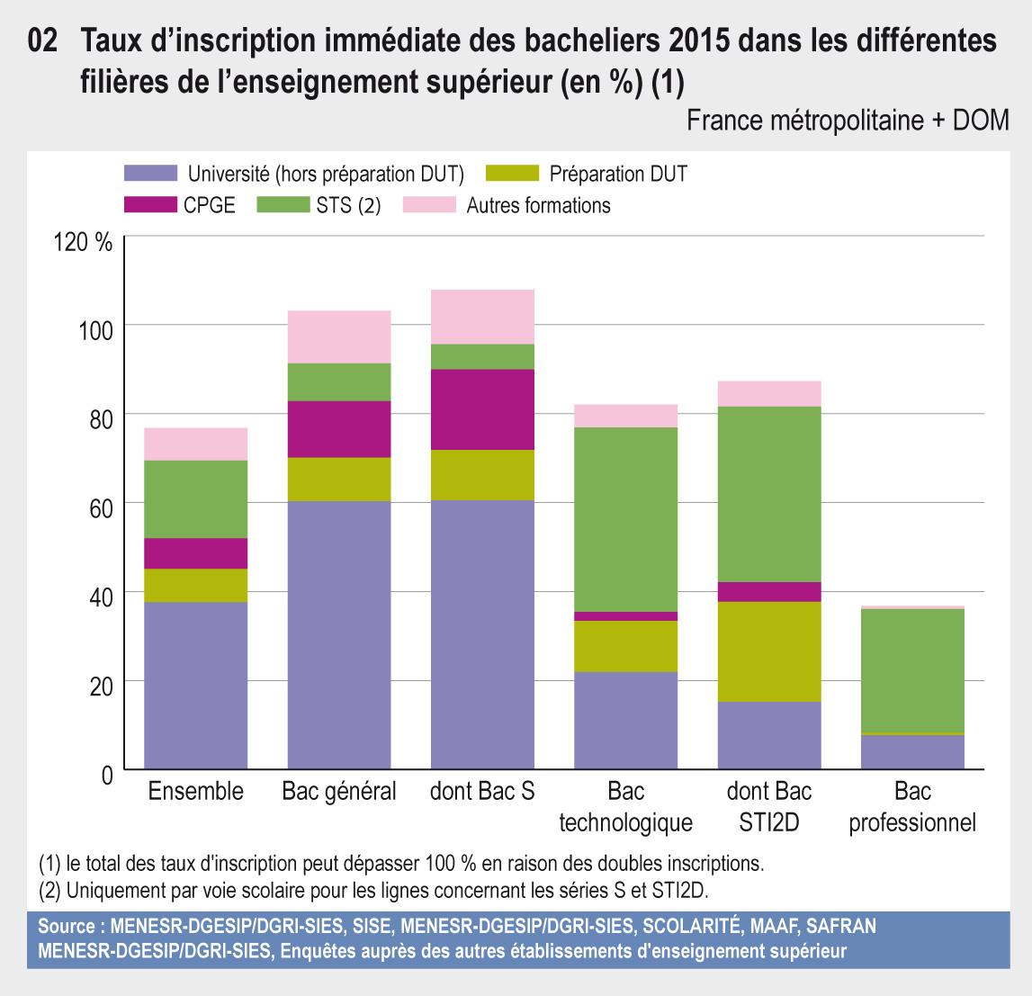 10.02 Taux d'inscription immédiate des bacheliers 2015 dans les différentes filières de l'enseignement supérieur (en %) 1