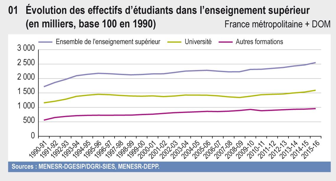 À la rentrée 2015, on compte 2 551 100 inscriptions dans l’enseignement supérieur. Le nombre d’étudiants inscrits progresse de 3,2 % par rapport à l’année précédente. Le nombre de jeunes s’engageant dans les études supérieures progresse fortement depuis 5 ans.