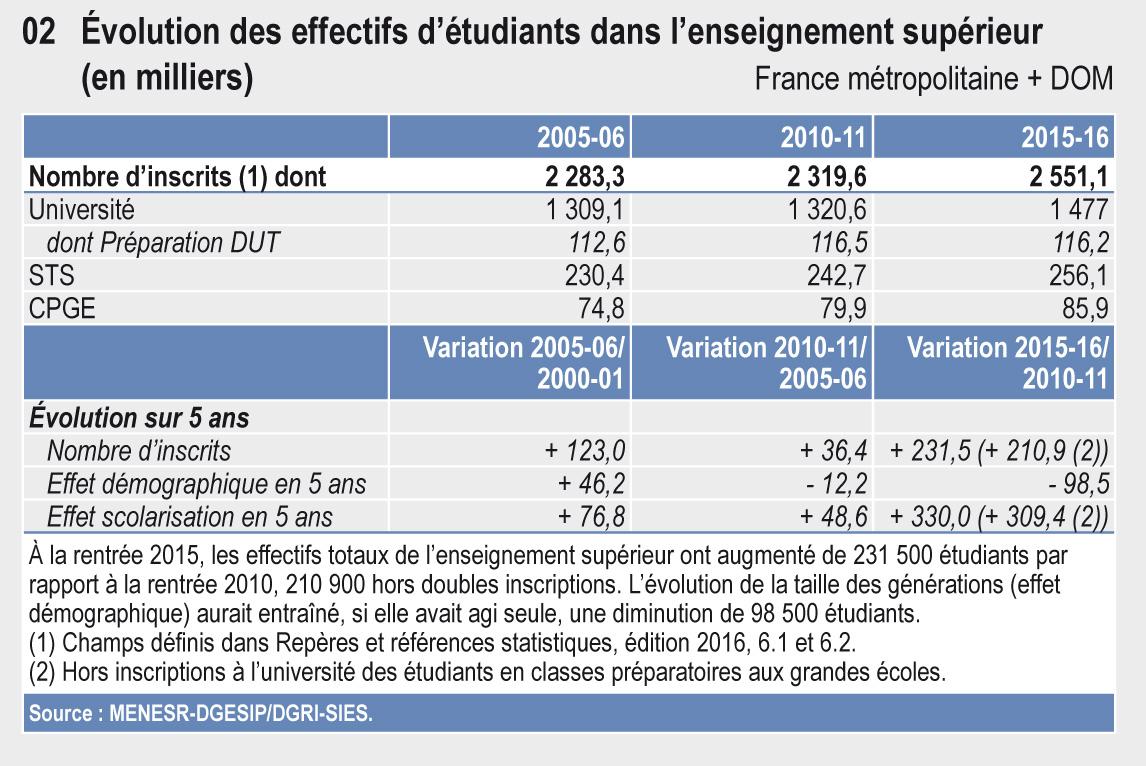 A la rentrée 2015, les effectifs totaux de l'enseignement supérieur ont augmenté de 231 500 étudiants par rapport à la rentrée 2010, 210 900 hors doubles inscriptions. L'évolution de la taille des générations (effet démographique) aurait entrainé, si elle avait agi seule, une diminution de 98 500 étudiants.