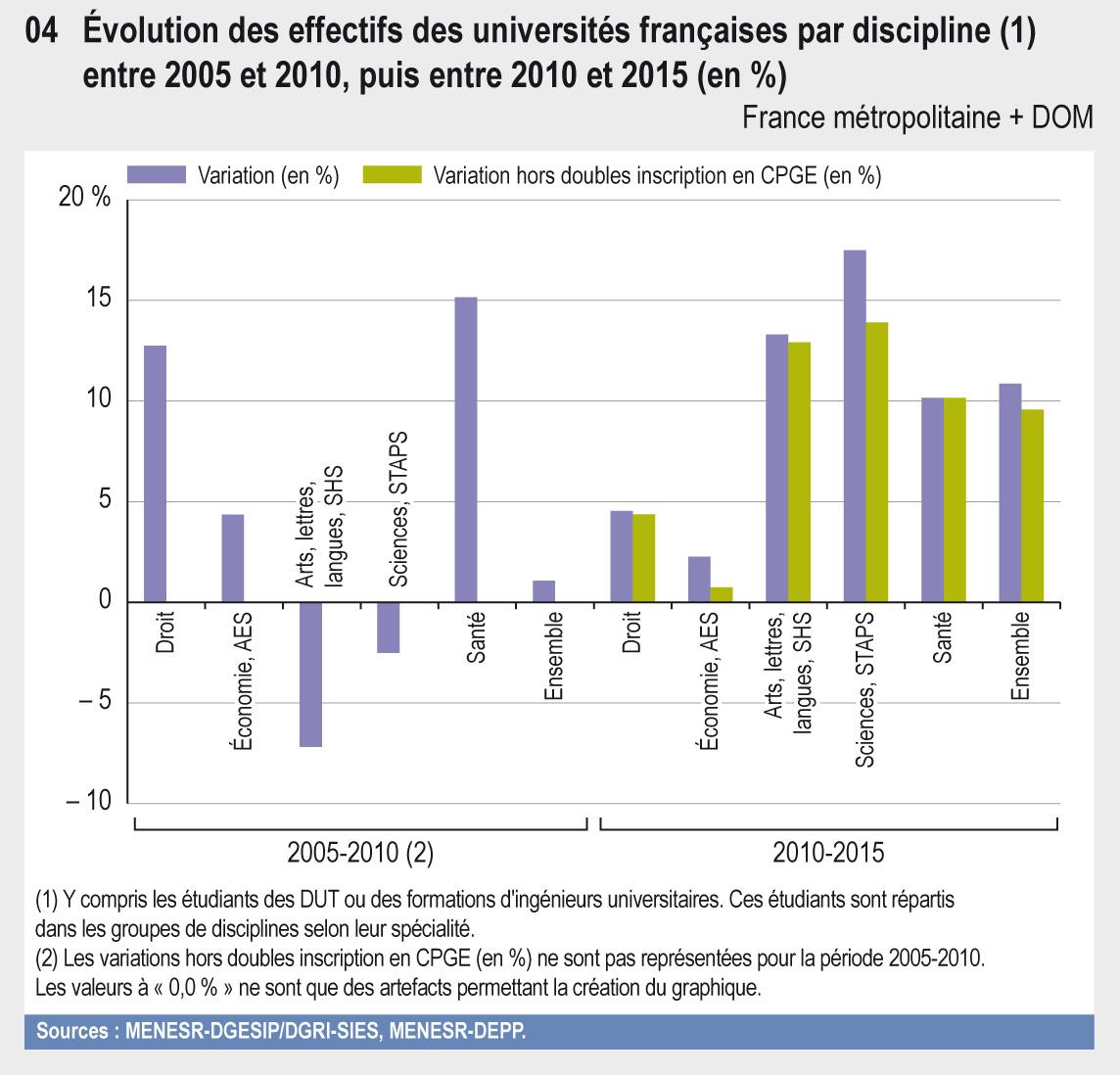 2 Les variation hors doubles inscription en CPGE (en %) ne sont pas représentées pour la période 2005-2010. Les valeurs à « 0,0 % » ne sont que des artefacts permettant la création du graphique.