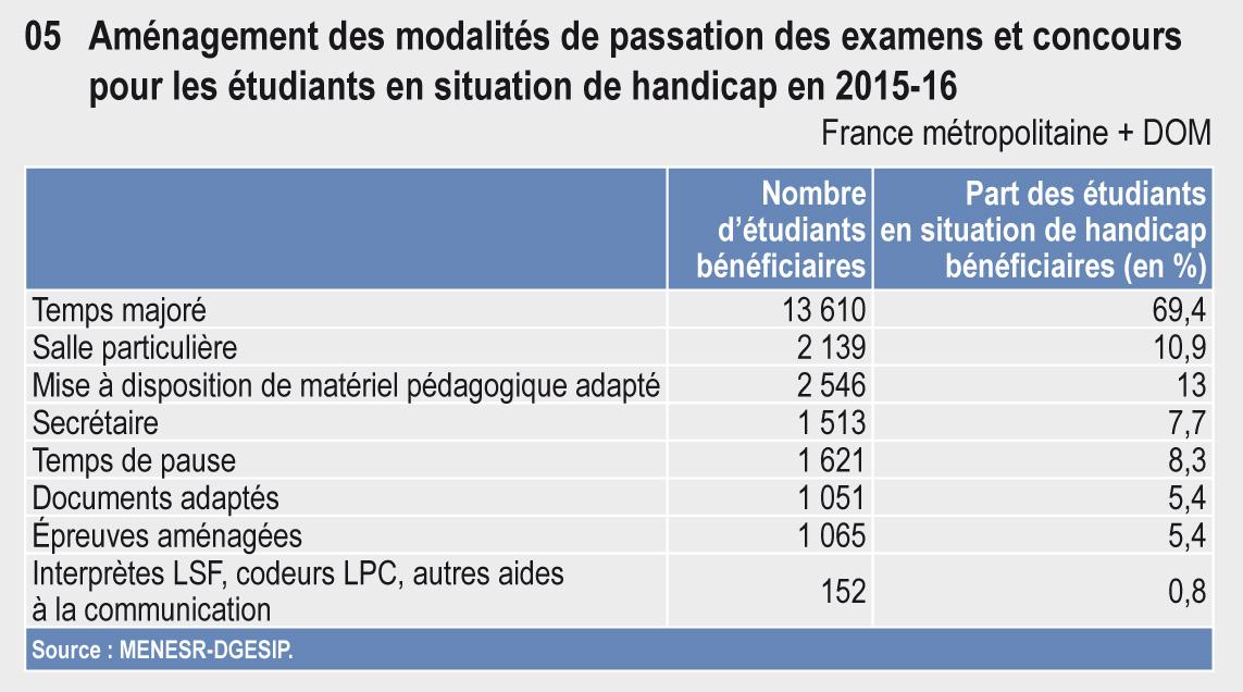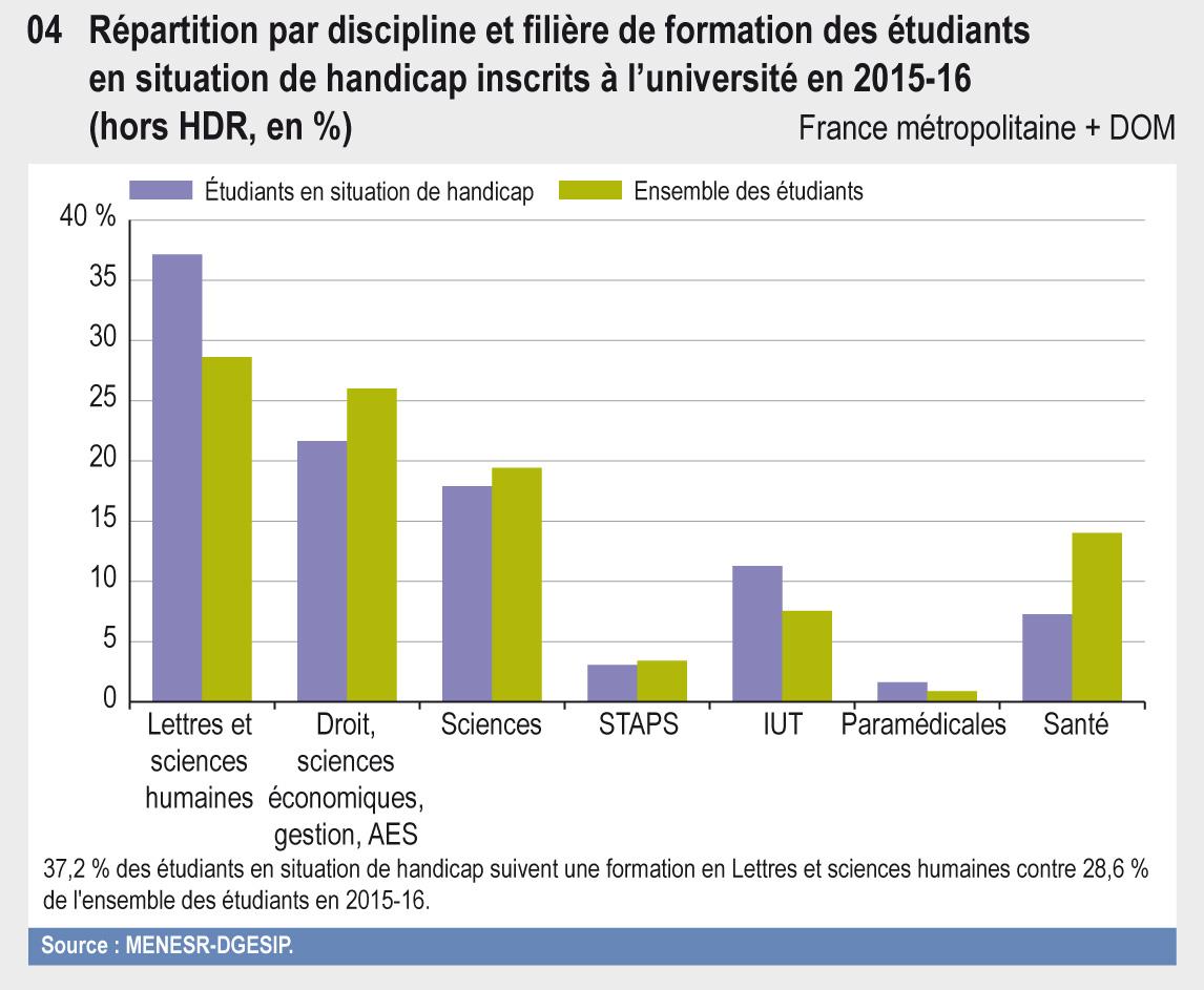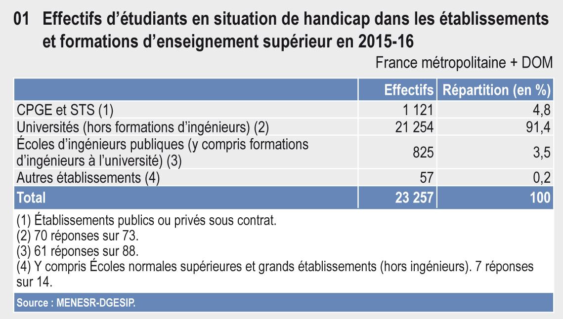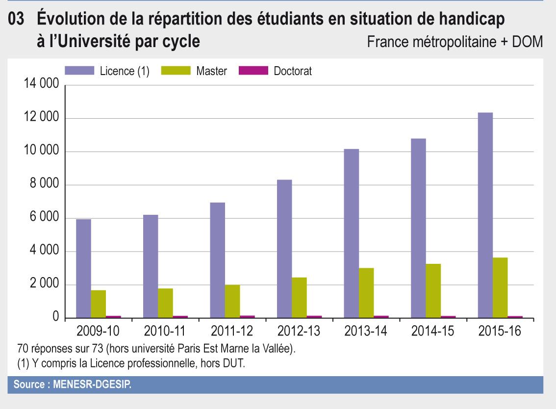 À la rentrée 2015, 23 257 étudiants des établissements d’enseignement supérieur publics se déclarent en situation de handicap soit 1,22 % de la population étudiante. Cet effectif a triplé depuis 2005. Parmi les étudiants en situation de handicap, 91 % sont inscrits à l’université, parmi lesquels 71 % bénéficient d’un plan d’accompagnement. Les aides sont plus nombreuses, diverses et mieux connues que par le passé, ce qui leur permet de ne pas rester à l’écart du mouvement général d’allongement des études. Si la progression dans leurs parcours reste différente de celle de la population, elle s’améliore très significativement depuis plusieurs années.