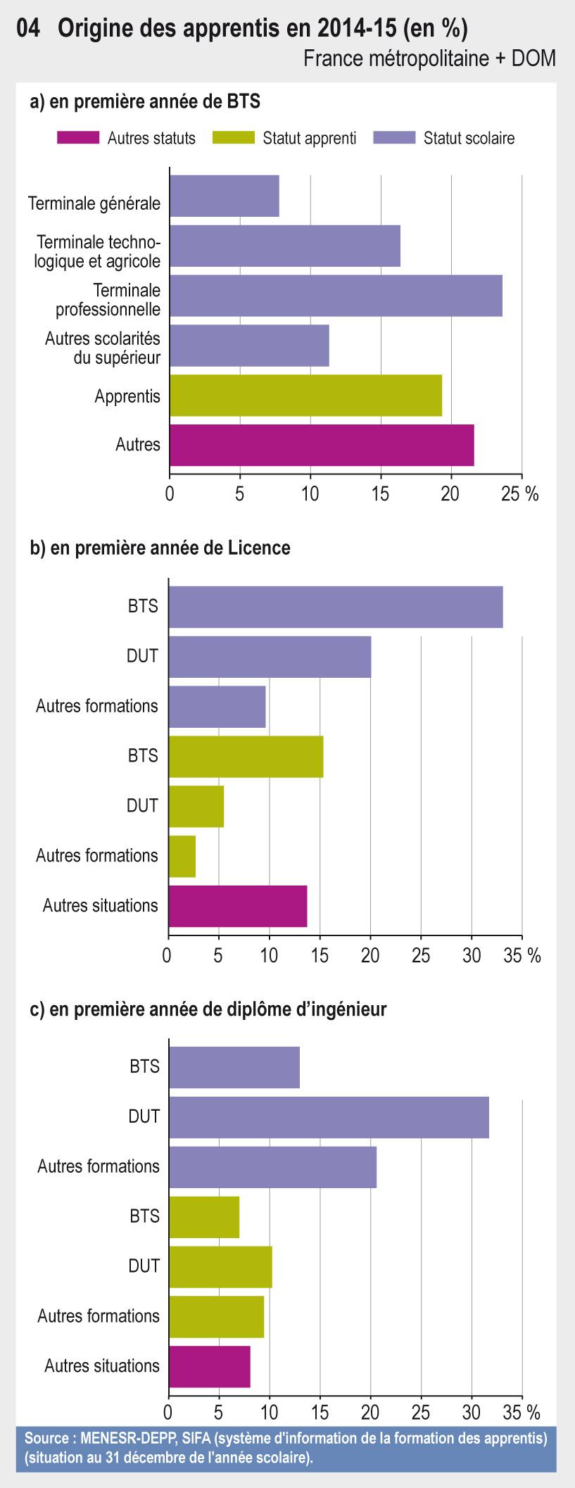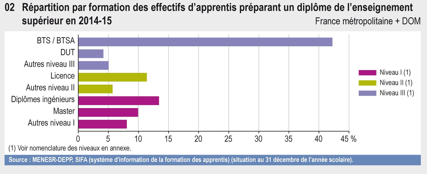 DEMONGEOT Aurélie. L’apprentissage dans le supérieur. In : État de l'Enseignement supérieur et de la Recherche en France - 49 indicateurs [en ligne]. KABLA-LANGLOIS Isabelle (dir.). Paris : Ministère de l'Éducation nationale, de l'Enseignement supérieur et de la Recherche, 2017 (10e éd.), fiche 17 [Consulté le 29/01/2026]. ISBN 978-2-11-152030-1. Disponible à l'adresse : https://publication.enseignementsup-recherche.gouv.fr/eesr/10/EESR10_ES_17-l_apprentissage_dans_le_superieur.php