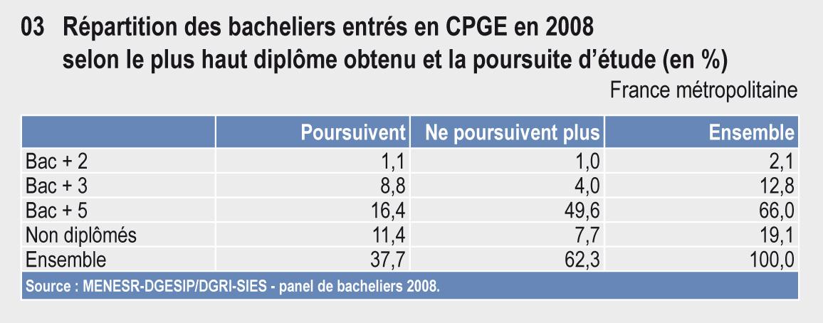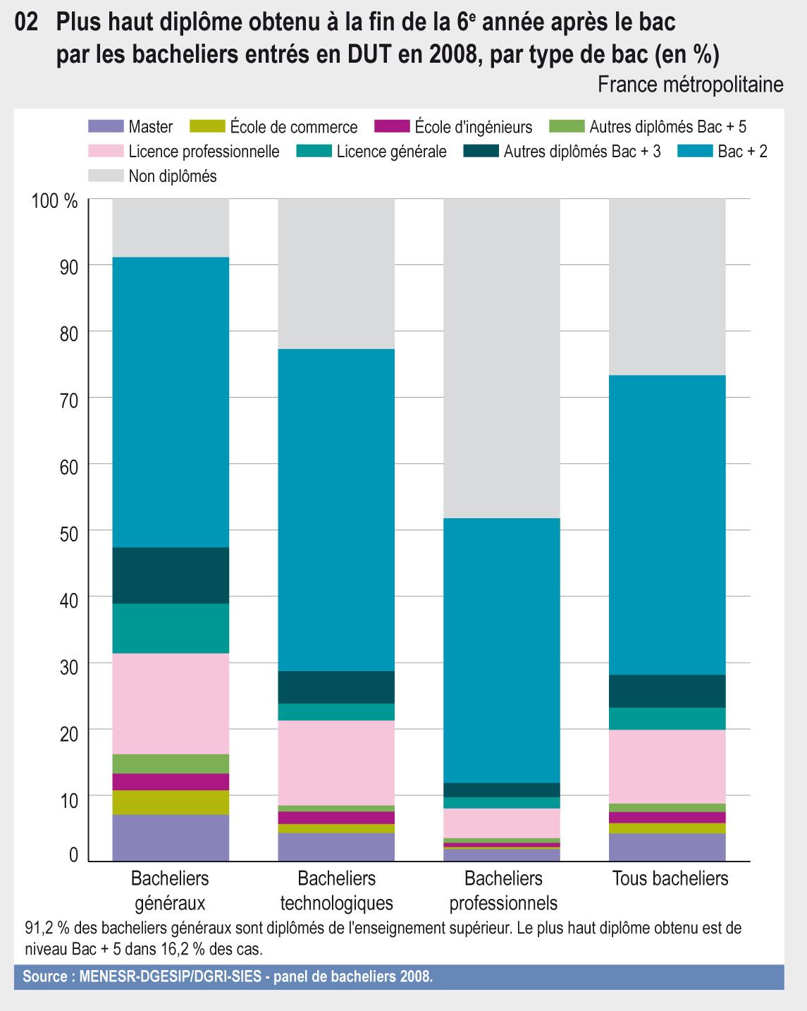 Dans les filières courtes de l’enseignement supérieur, la plupart des bacheliers entrés en 2008 ne poursuivent plus d’études au début de la 7ème année après le bac (96 % en BTS et 88 % en DUT). La part de diplômes supérieurs à Bac + 2 est élevée : 28 % en filière STS et 70 % en DUT. En revanche, 4 étudiants sur 10 entrés en CPGE poursuivent encore leurs études, et les deux tiers détiennent un diplôme de niveau Bac + 5.