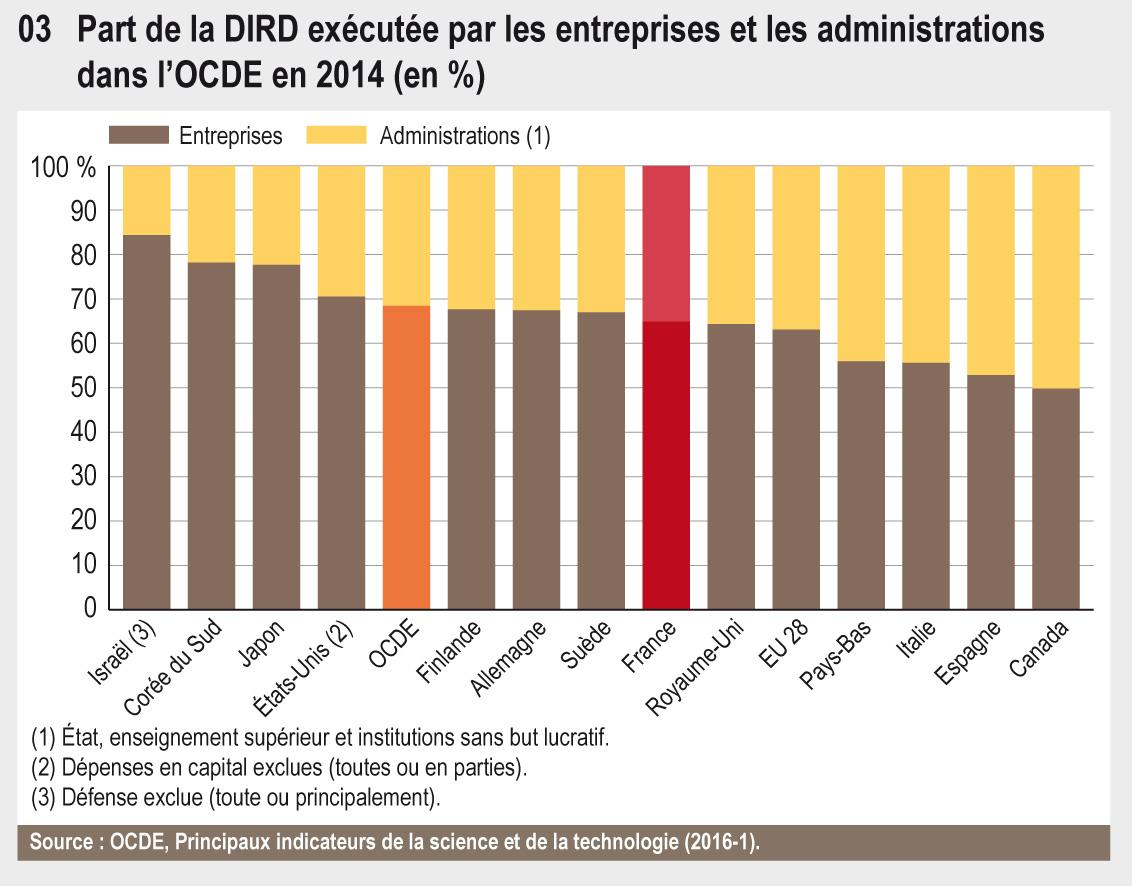 27.03 Part de la DIRD exécutée par les entreprises et les administrations dans l'OCDE en 2014 en %)