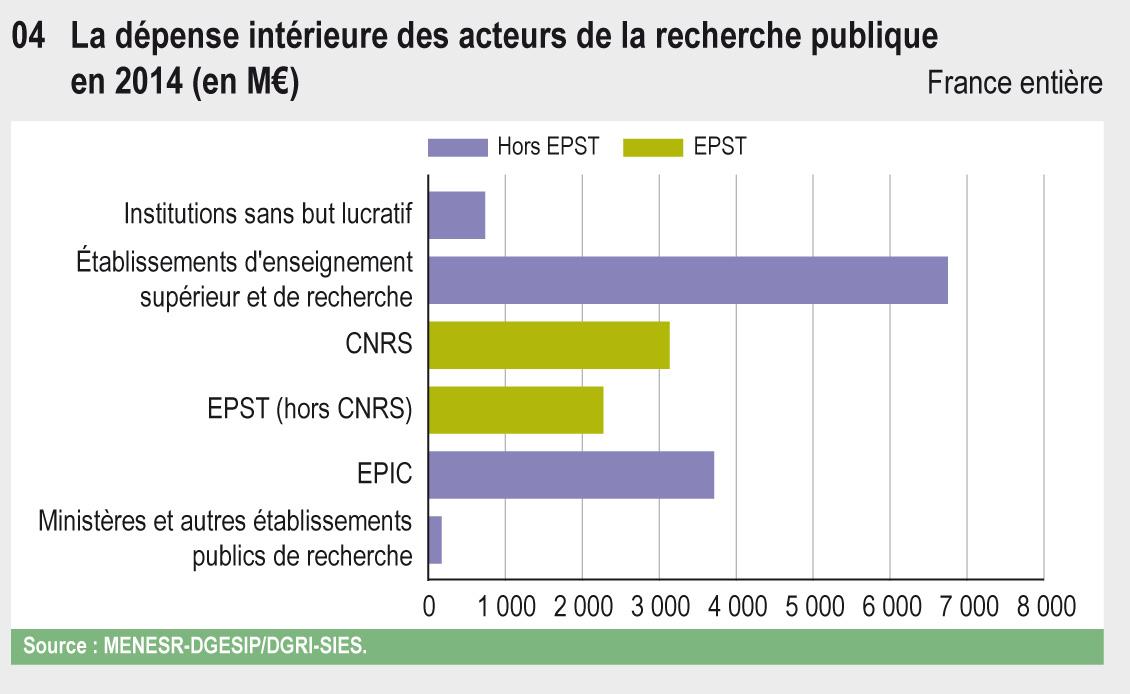 En 2014, six branches de recherche (automobile, aéronautique, pharmacie, activités spécialisées, scientifiques et techniques, activités informatiques et services d’information et chimie) exécutent la moitié de la dépense intérieure de R&D des entreprises. Dans le secteur public, les organismes de recherche (EPST, EPIC) exécutent 54 % de la dépense intérieure de R&D des administrations.