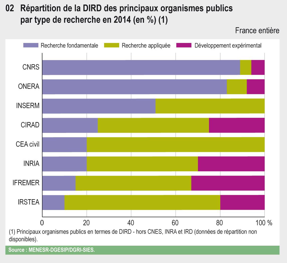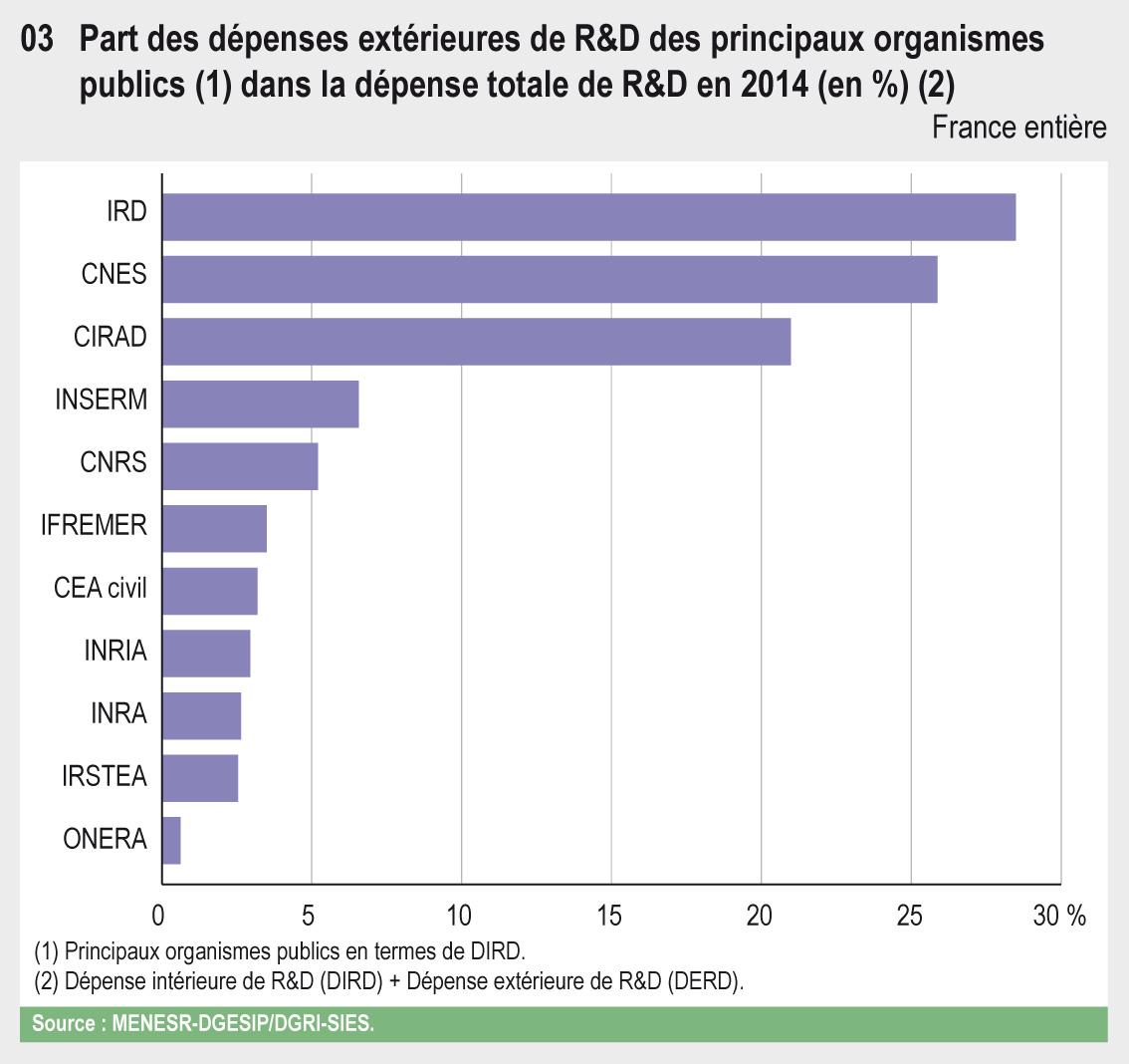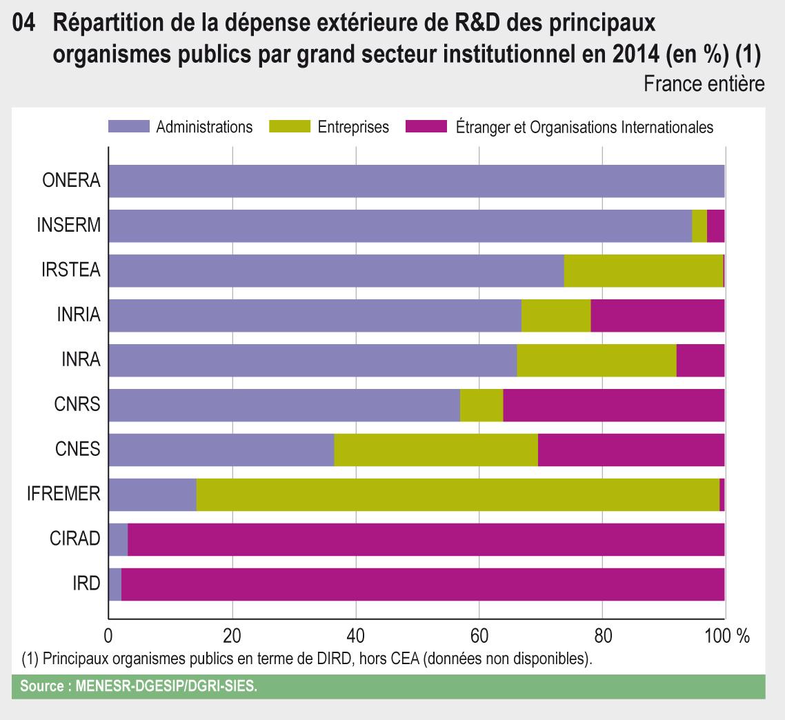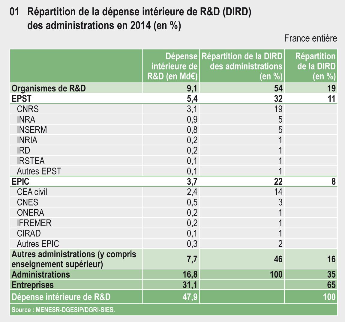 En 2014, la dépense intérieure de recherche et développement (DIRD) des principaux organismes publics de recherche s’élève à 9,1 milliards d’euros (Md€). Elle baisse de 1,1 % en volume par rapport à 2013, après avoir légèrement augmenté de 0,1 % l’année précédente. Réalisant 54 % de la recherche publique, ils sont des acteurs majeurs de la recherche en France. Avec 5,5 Md€ de DIRD au total, le CNRS et le CEA civil effectuent un tiers de la recherche publique.