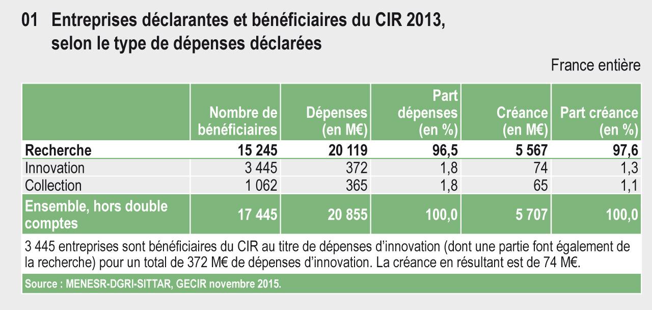 Depuis 2013, le Crédit d’impôt recherche comporte trois composantes en fonction du type de dépenses éligibles : dépenses de recherche, dépenses d’innovation et dépenses de collection pour les secteurs textile-habillement-cuir. La créance 2013 est de 5,57 Md€ au titre des dépenses de recherche, 74 M€ au titre des dépenses d’innovation et 65 M€ au titre des dépenses de collection, soit un total de 5,7 Md€.