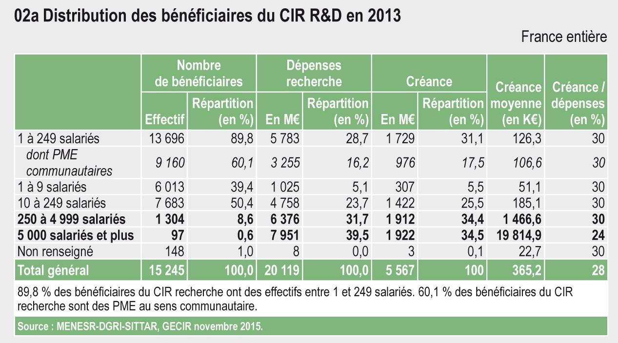 89,8 % des bénéficiaires du CIR recherche ont des effectifs entre 1 et 249 salariés. 60,1 % des bénéficiaires du CIR recherche sont des PME au sens communautaire.