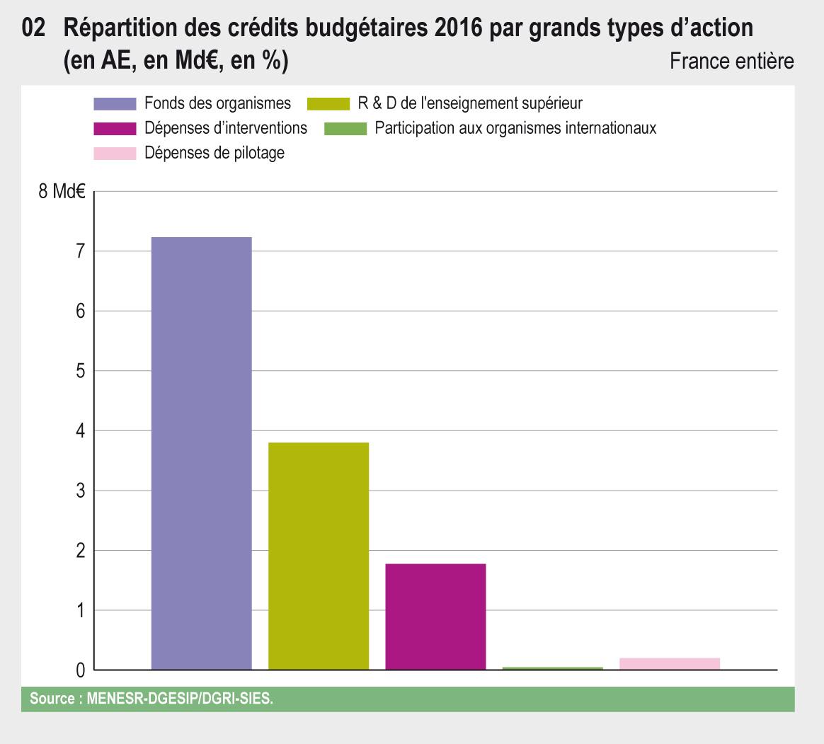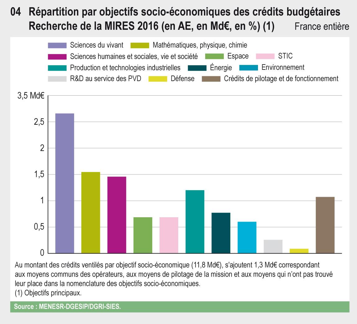 En 2016, la Mission Interministérielle Recherche et Enseignement Supérieur (MIRES) regroupe 13 milliards d’euros (Md€) de crédits budgétaires pour la recherche. Environ 80 % de ces crédits sont attribués aux opérateurs de recherche et d’enseignement supérieur au titre de subvention pour charge de service public et 49 % sont dédiés à la recherche fondamentale.