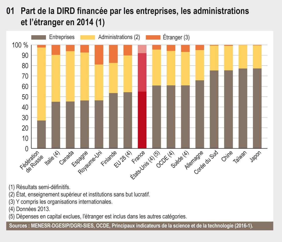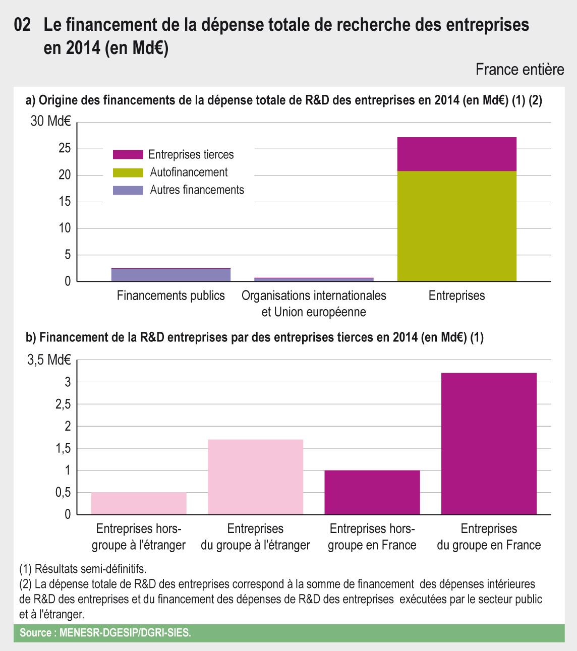 En 2014, les entreprises consacrent 26,1 Md€ au financement de la R&D. Elles financent donc 55 % de la dépense intérieure de recherche et développement expérimental (DIRD).