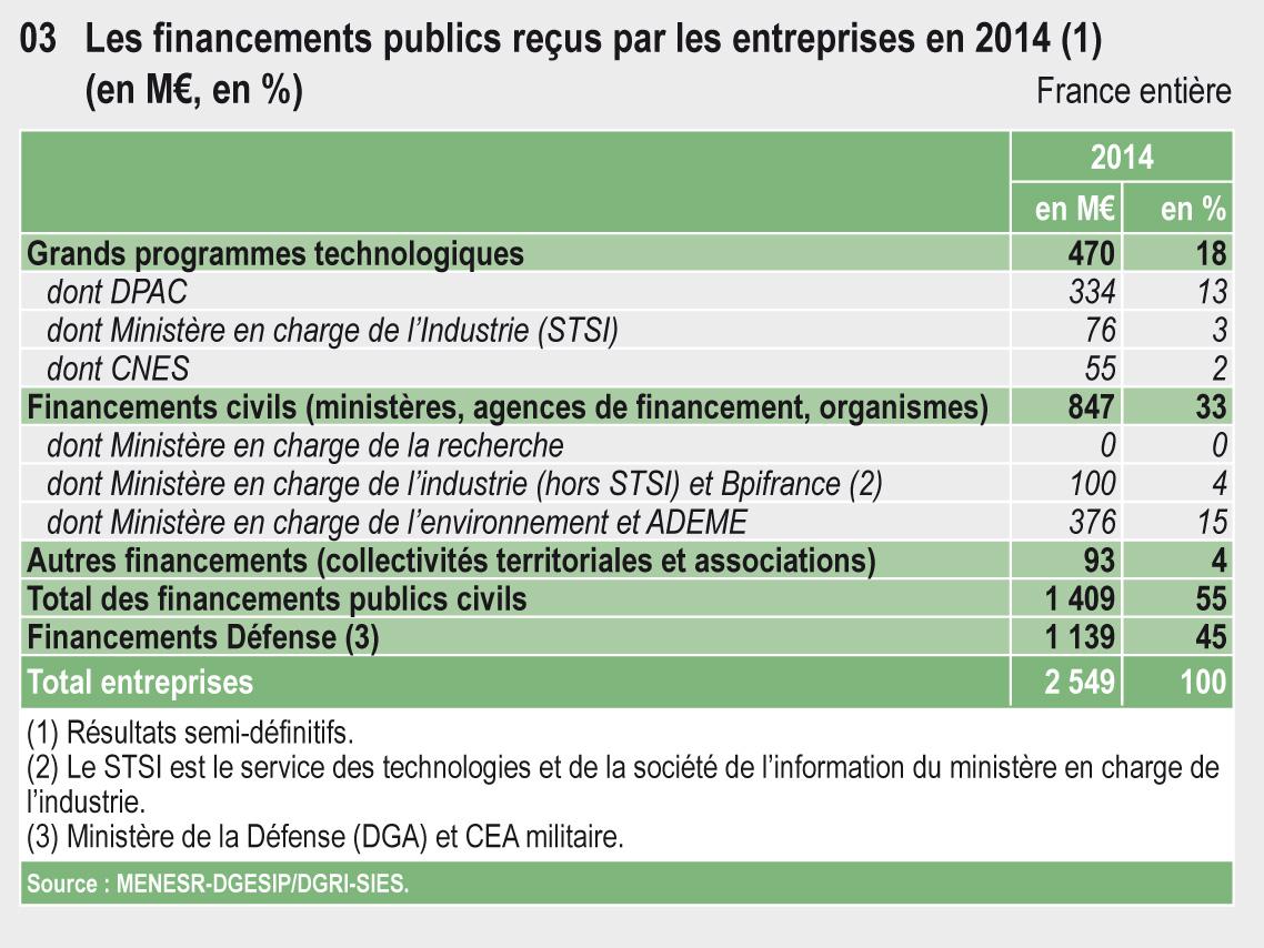 Le financement public à la R&D des entreprises correspond aux contrats de R&D passés avec les organismes publics de recherche et aux dispositifs de soutien public, direct ou indirect. Le soutien direct s’effectue dans le cadre de subventions, d’appels à projets ou de contrats soutenant des programmes porteurs d’enjeux majeurs (tableau 34.03). Les recherches effectuées peuvent correspondre à des commandes des administrations (2,5 Md€), notamment les crédits militaires (1,1 Md€), de la Direction générale de l'aviation civile (DGAC) ou à des travaux menés par les entreprises et soutenus par des organismes tels Bpifrance, l’agence nationale de la recherche (ANR) ou par le ministère de l’Éducation nationale, de l’Enseignement supérieur et de la Recherche. Le soutien public indirect est mis en œuvre au travers de différents dispositifs fiscaux et d’avances remboursables (en cas de succès commercial) qui ne sont pas comptabilisés ici. Le dispositif le plus important est le CIR (crédit d’impôts recherche) dont les créances se sont élevées à 5,6 Md€ en 2013 et qui concernait 19 700 entreprises implantées en France (voir fiche 31).