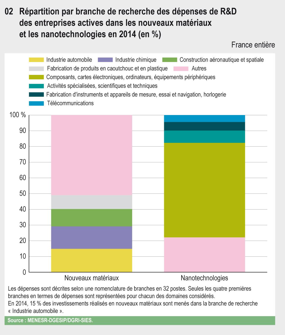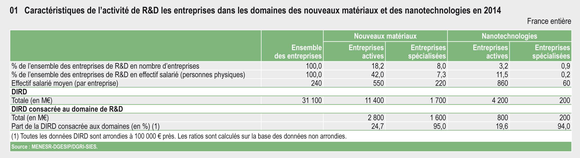 En France, en 2014, une entreprise active en de R&D sur cinq engage des dépenses intérieures de R&D dans les domaines des nouveaux matériaux ou des nanotechnologies. La dépense de recherche globale associée à ces deux domaines s’élève à 3,6 milliards d'euros (Md€) en 2014, soit 11,7 % de l’ensemble de la DIRDE.