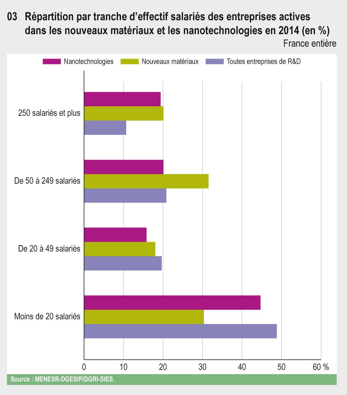 En nanotechnologies, en revanche, ce sont de plus petites structures qui engagent des dépenses de R&D : en 2014, 61 % des entreprises actives dans ce domaine de recherche ont moins de 50 salariés. La proportion d’entreprises classées dans cette tranche d'effectifs est sensiblement la même en France qu’en Corée du Sud (60 %) et qu’en Finlande (59 % en 2013). En revanche, cette catégorie est plus fortement représentée en Allemagne, où 75 % des entreprises actives en nanotechnologies ont moins de 50 salariés (données 2012) et aux États-Unis (69 %).