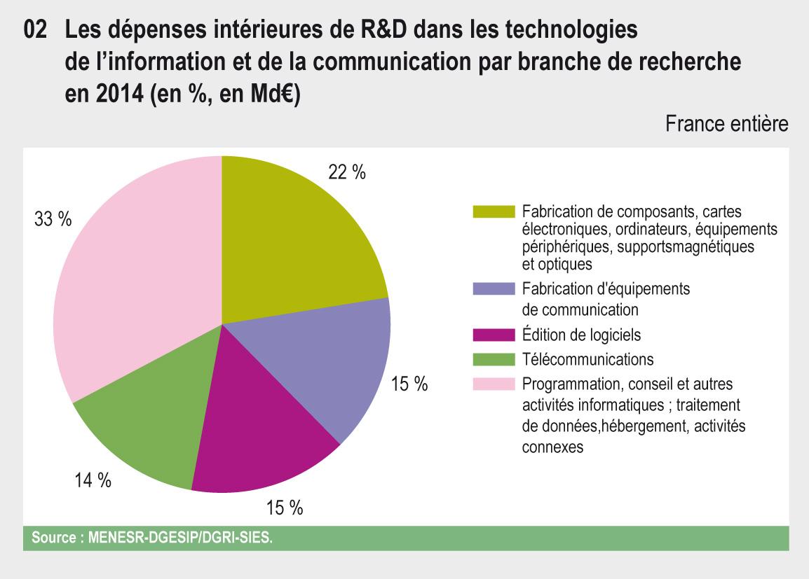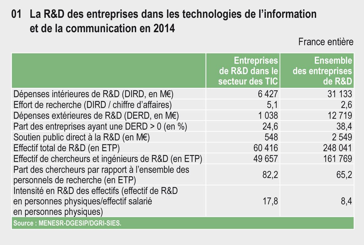 Les dépenses intérieures de recherche et développement des entreprises dans les technologies de l’information et de la communication (TIC) s’élèvent à 6,4 Md€ en 2014, soit 21 % de l’ensemble des dépenses intérieures de R&D des entreprises. On compte 60 416 personnels en équivalents temps plein employés dans des branches de recherche appartenant aux TIC, dont 82 % de chercheurs ou ingénieurs de R&D. Les administrations concourent de manière beaucoup plus limitée à l’effort de R&D en TIC.