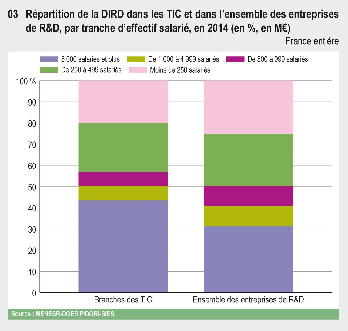43.03 Répartition de la DIRD dans les TIC et dans l'ensemble des entreprises de R&D, par tranche d'effectif salarié, en 2014 (en %, en M€)