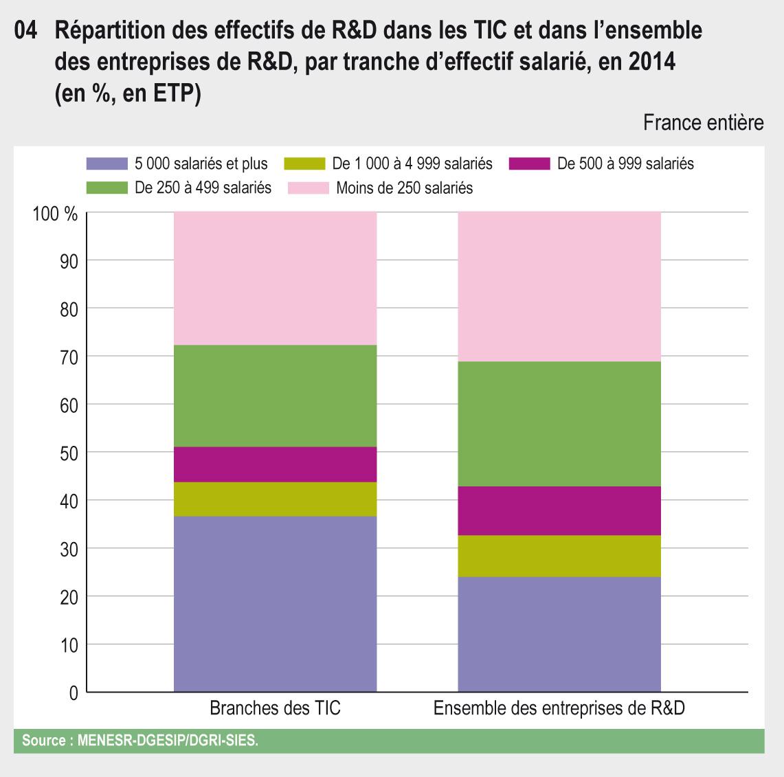 43.04 Répartition des effectifs de R&D dans les TIC et dans l'ensemble des entreprises de R&D, par tranche d'effectif salarié, en 2014 (en %, en ETP)