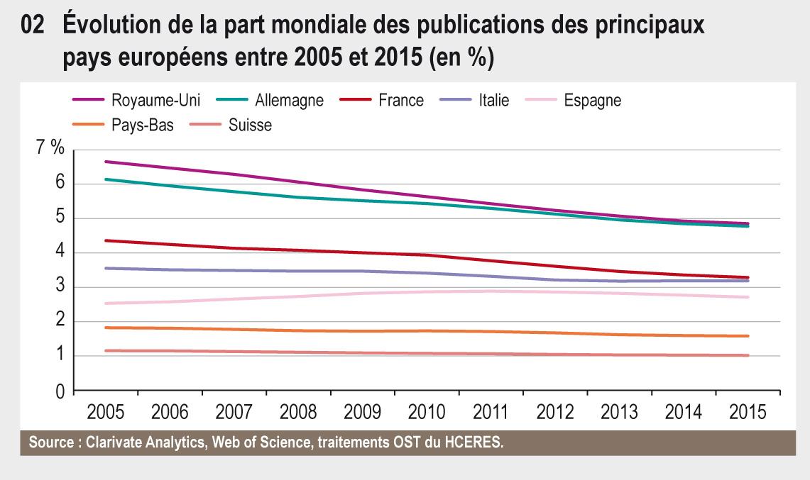 47.02 Évolution de la part mondiale des publication des principaux pays européens entre 2005 et 2015 (en %)