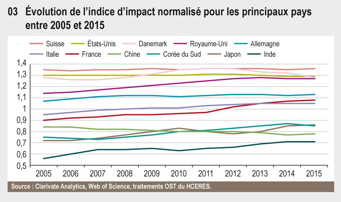 L’impact scientifique des publications des principaux producteurs occidentaux (indice d’impact normalisé par spécialité) reste supérieur à celui des pays asiatiques (graphique 47.03). La Suisse et les États-Unis ont les indices d’impacts les plus élevés, stables depuis 10 ans. Le Royaume-Uni a vu son indice d’impact augmenter fortement jusqu’en 2012 pour se rapprocher de celui des États-Unis. Les indices d’impact de la France et de l’Italie, inférieurs à la moyenne mondiale en 2005, ont sensiblement augmenté pour se rapprocher de celui de l’Allemagne. L’indice d’impact de la Chine et de la Corée du Sud progresse fortement, mais reste néanmoins nettement inférieur à la moyenne mondiale. L’indice d’impact du Japon s’érode et passe en dessous de ceux de la Corée et de la Chine.