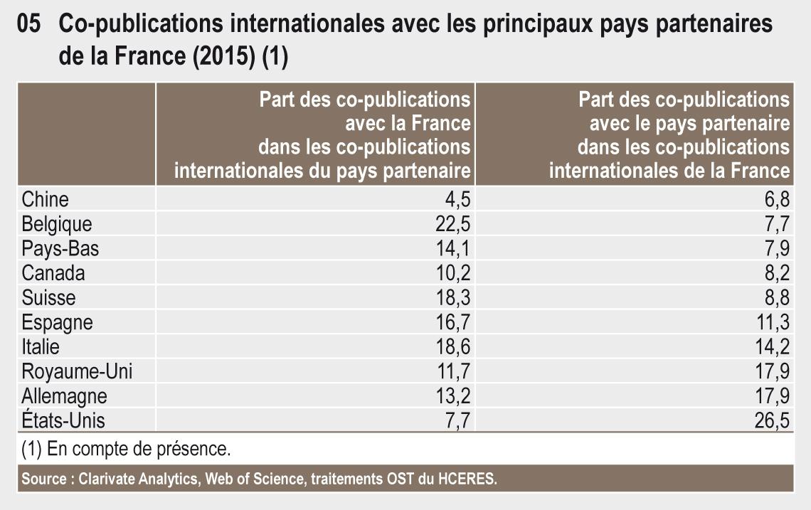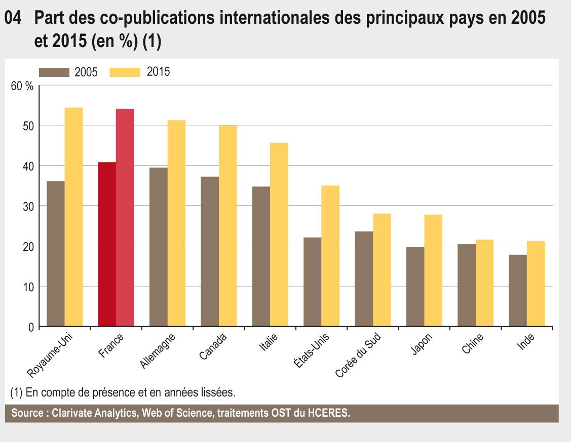 Parmi les 10 premiers pays publiant du monde, la France présente l’un des taux de copublications internationale les plus élevés, équivalent à celui du Royaume-Uni et de l’Allemagne. Les copublications internationales tendent à augmenter à l’échelle mondiale, mais de façon variable selon les pays. En 2015, le taux de publications impliquant au moins un laboratoire à l’étranger dépasse 50 % pour la France et pour de nombreux pays européens. Les États-Unis ont une part de copublications internationales plus faible (35 %), notamment du fait de leur taille. Leurs copublications internationales sont néanmoins en forte augmentation depuis 2005 (+ 60 %). La part des copublications internationales des pays asiatiques est sensiblement plus faible ; entre 21 % et 28 % pour le Japon, la Chine, l’Inde et la Corée du Sud. Le Japon développe fortement ces collaborations (+ 40 % de de 2005 à 2015) alors qu’elles stagnent en Chine (+ 5,4 % de 2005 à 2015).