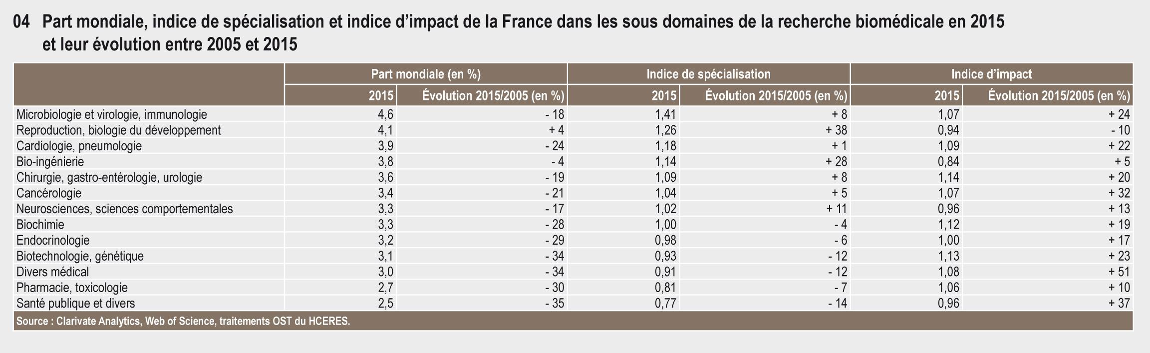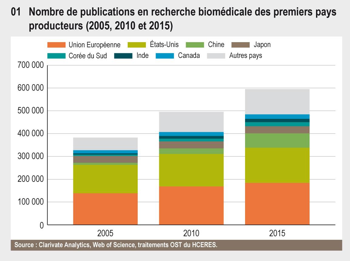 En 2015, l’Union européenne, les États-Unis et la Chine concentrent près de 75 % des publications en recherche biomédicale. La France, qui est moins spécialisée en recherche biomédicale que les États-Unis ou certains pays européens, se situe au 7e rang avec 20.000 articles, soit 3,4 % des publications mondiales. Elle est classée 8ème en termes de citations reçues mais présente un indice d’impact supérieur à la moyenne mondiale.