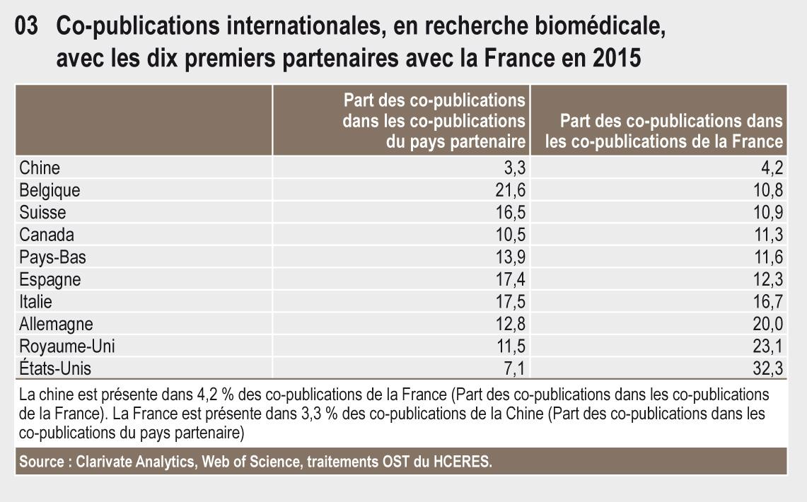 48.03 Co-publications internationales, en recherche biomédicale, avec les dix premiers partenaires avec la France en 2015