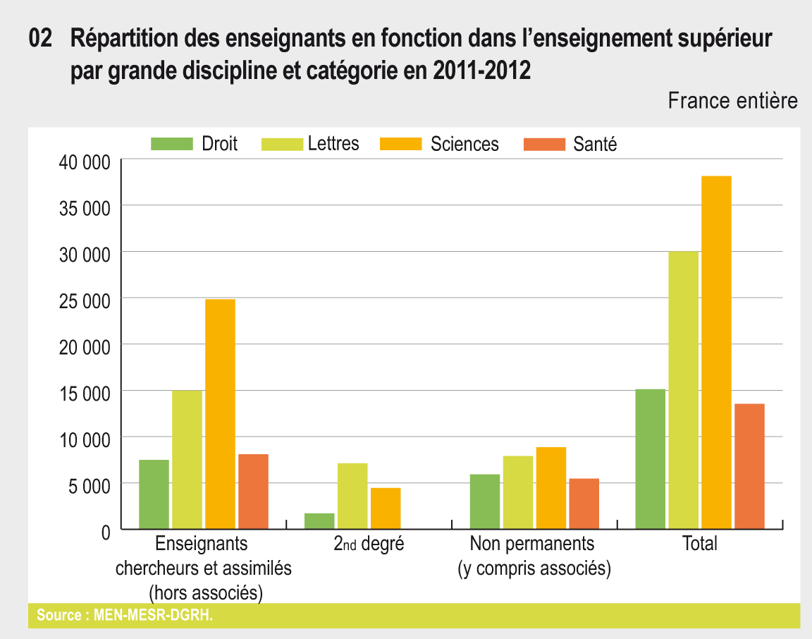En 2011-2012, 97 900 enseignants exercent dans les établissements publics d’enseignement supérieur sous tutelle du MESR, sur un total d’environ 150 000 personnes. Avec 15,8 étudiants par enseignant du supérieur, la France présente un taux d’encadrement proche de la moyenne des pays de l’OCDE. Environ un quart des enseignants est affecté en Ile-de-France.