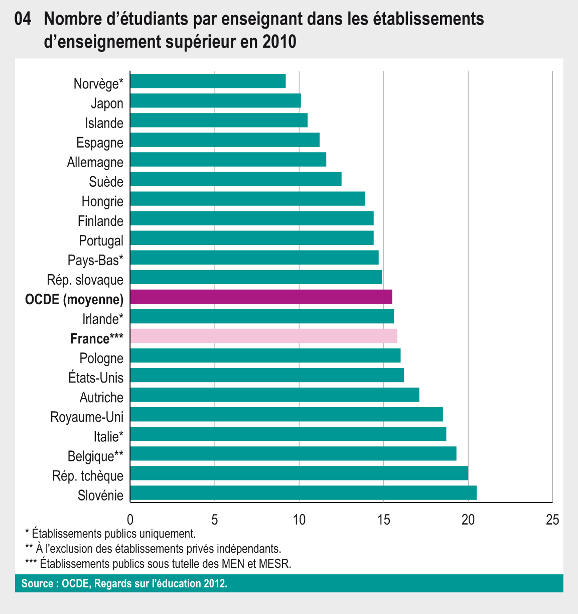 04.04 Nombre d'étudiants par enseignant dans les établissements d'enseignement supérieur en 2010