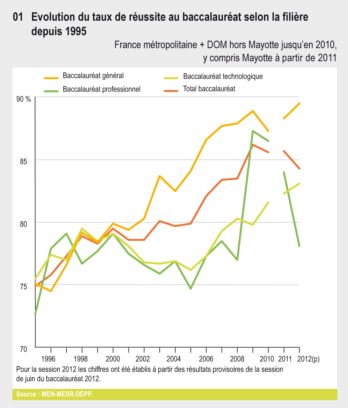 Entre 1995 et 2011, il a augmenté de 10,8 points (hors Mayotte) : + 13,2 points dans la voie générale, + 7 points dans la voie technologique et + 11,3 points dans la voie professionnelle. Selon les résultats provisoires de 2012, 293 000 candidats ont obtenu un baccalauréat général, 124 000 un baccalauréat technologique et 188 000 un baccalauréat professionnel. Le taux de réussite au baccalauréat diminuerait de plus de 1 point par rapport à 2011, la hausse dans les voies générale et technologique ne suffisant pas à compenser l’importante baisse de la voie professionnelle.