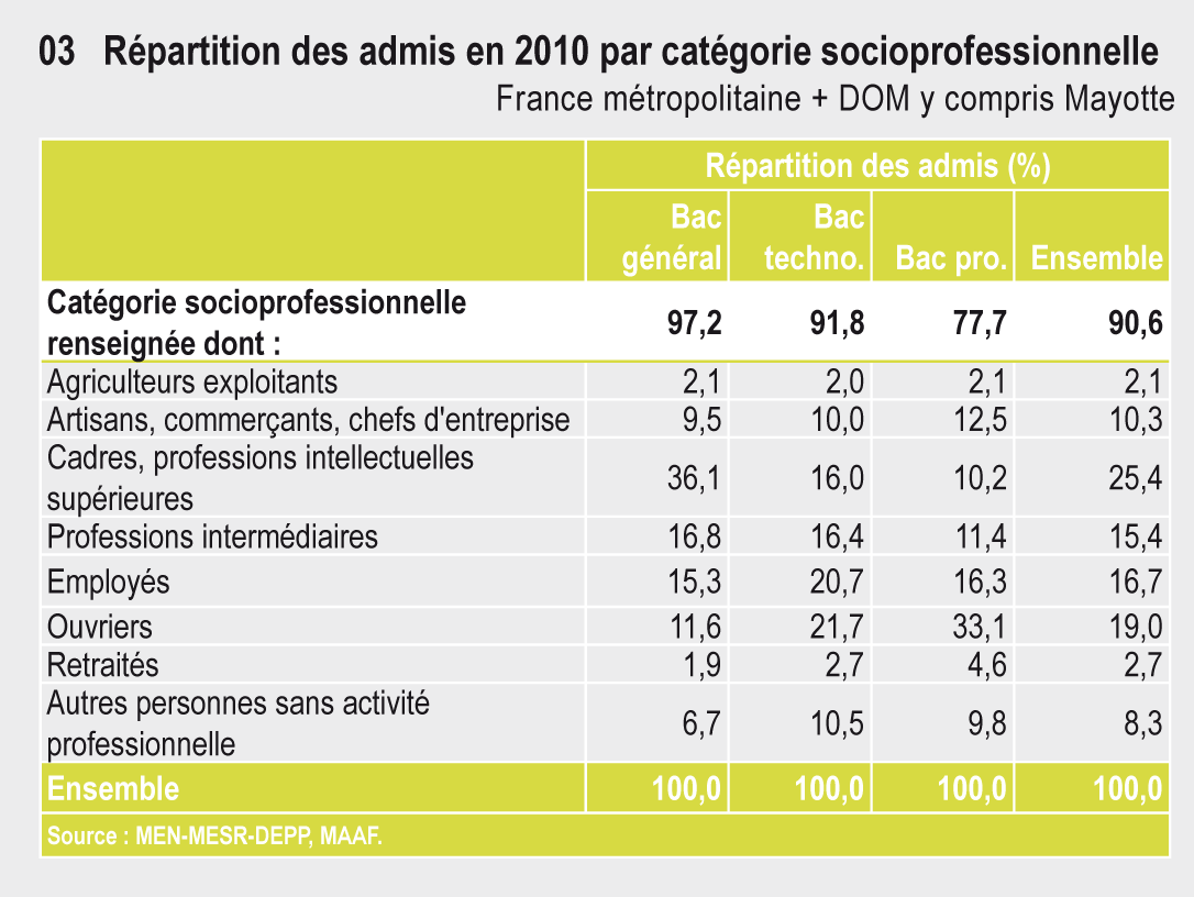 À la session 2011, le taux de réussite au baccalauréat atteint 85,7 %. Plus d’un bachelier généraliste sur trois est enfant de cadre ou profession intellectuelle supérieure. Au total en 2011, 71,6 % des jeunes d’une génération ont obtenu un baccalauréat. Pour la moitié d’entre eux, il s’agit d’un baccalauréat technologique ou professionnel.
