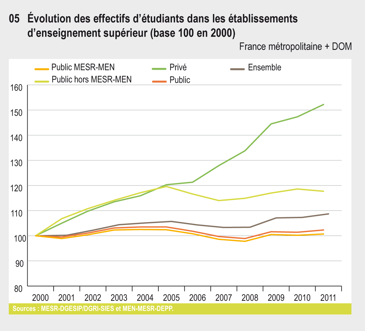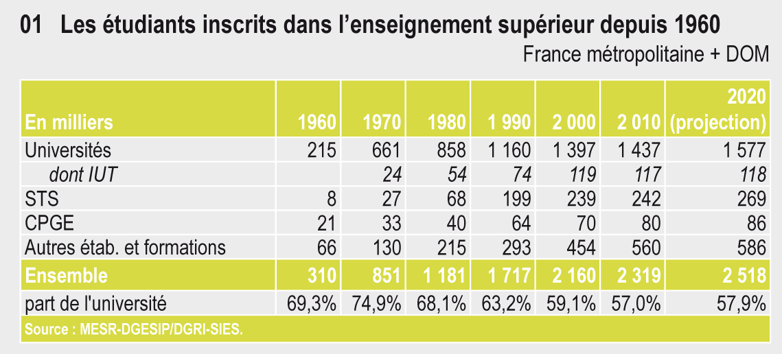 En 2011, on compte 2 350 000 étudiants, 8 fois plus qu’en 1960. Ces 10 dernières années, c’est l’enseignement supérieur privé qui a concentré l’essentiel de ce dynamisme. Il représente près de 18 % des effectifs d’étudiants. Depuis 1960, l’offre de formation s’est diversifiée et, désormais, moins d’un étudiant sur deux est inscrit dans une filière générale de l’université.