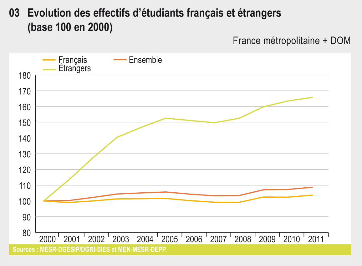 En 2011, on compte 2 350 000 étudiants, 8 fois plus qu’en 1960. Ces 10 dernières années, c’est l’enseignement supérieur privé qui a concentré l’essentiel de ce dynamisme. Il représente près de 18 % des effectifs d’étudiants. Depuis 1960, l’offre de formation s’est diversifiée et, désormais, moins d’un étudiant sur deux est inscrit dans une filière générale de l’université.