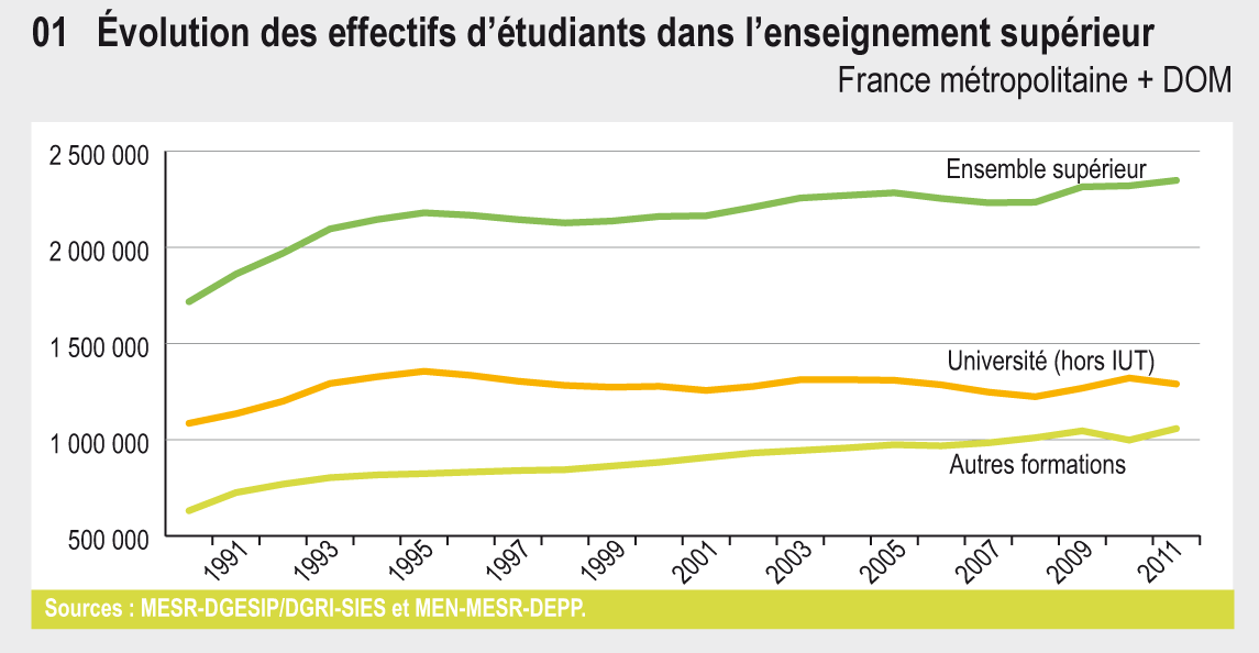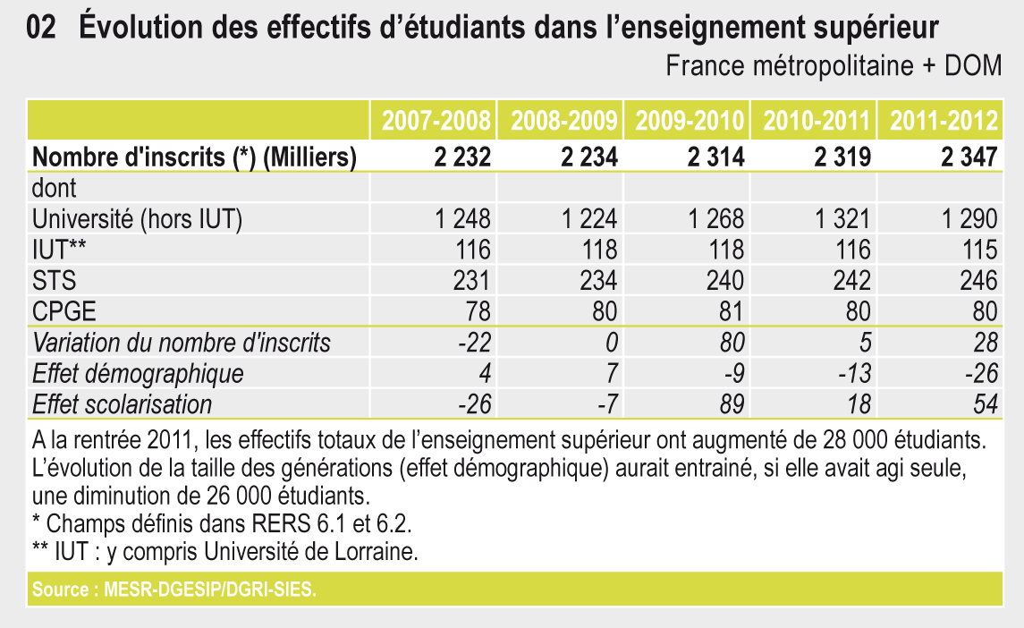 A la rentrée 2011, les effectifs totaux de l'enseignement supérieur ont augmenté de 28 000 étudiants. L'évolution de la taille des générations (effet démographique) aurait entrainé, si elle avait agi seule, une diminution de 26 000 étudiants.