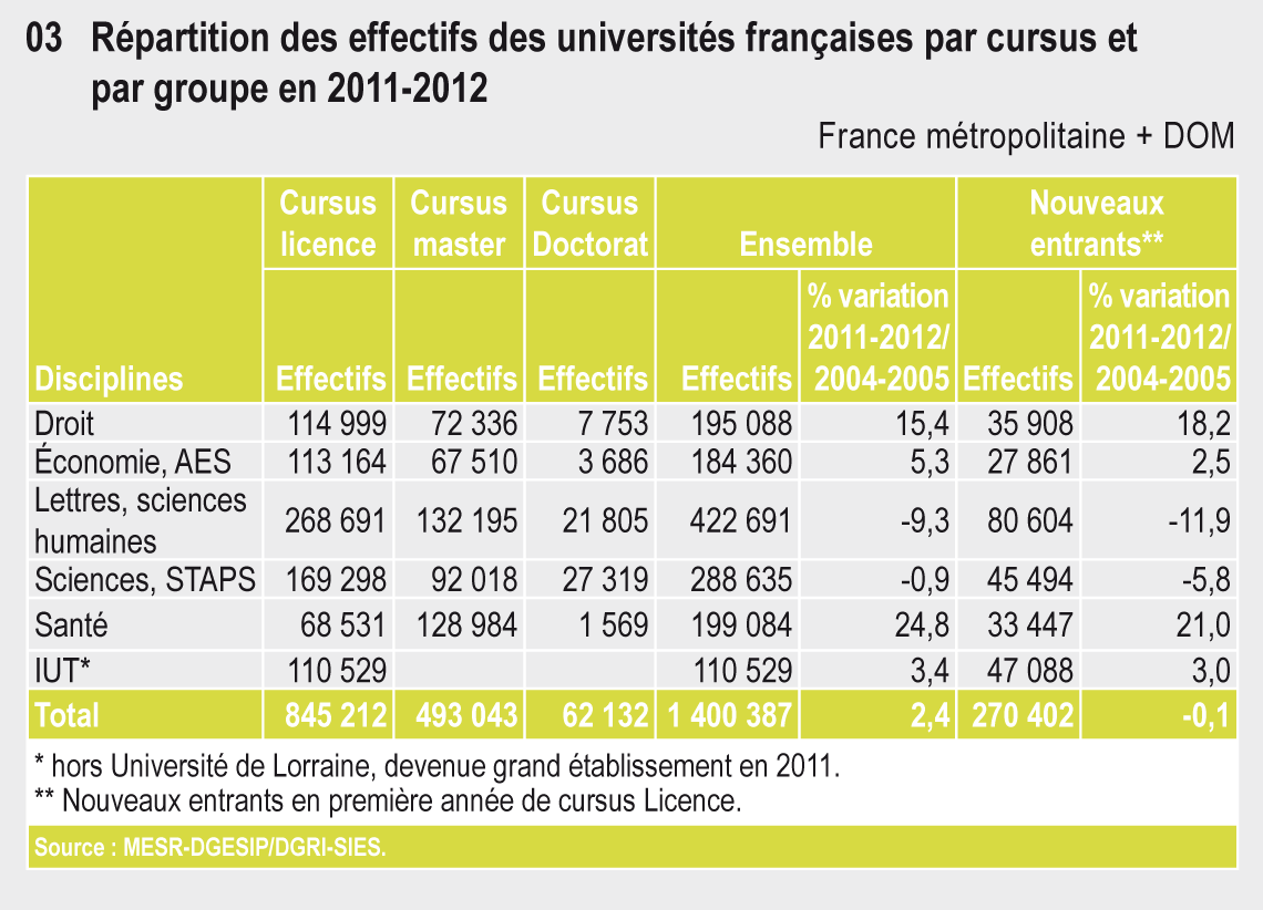 11.03 Répartition des effectifs d'étudiants des universités françaises par cursus et par groupe en 2011-2012