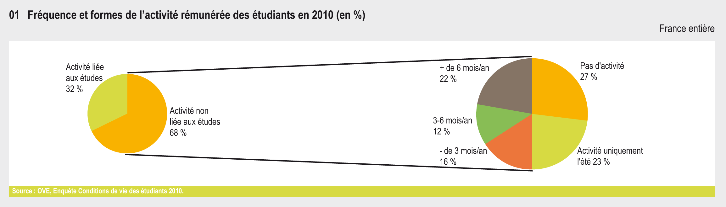 En 2010, sept étudiants sur dix ont exercé une activité rémunérée. Si 20 % des étudiants réservent cette activité à la période estivale, 50 % connaissent une période d’activité rémunérée en cours d’année universitaire. La part des étudiants exerçant une activité rémunérée liée à leurs études atteint 14 % en 2010, en progression de 5 points par rapport à 2006