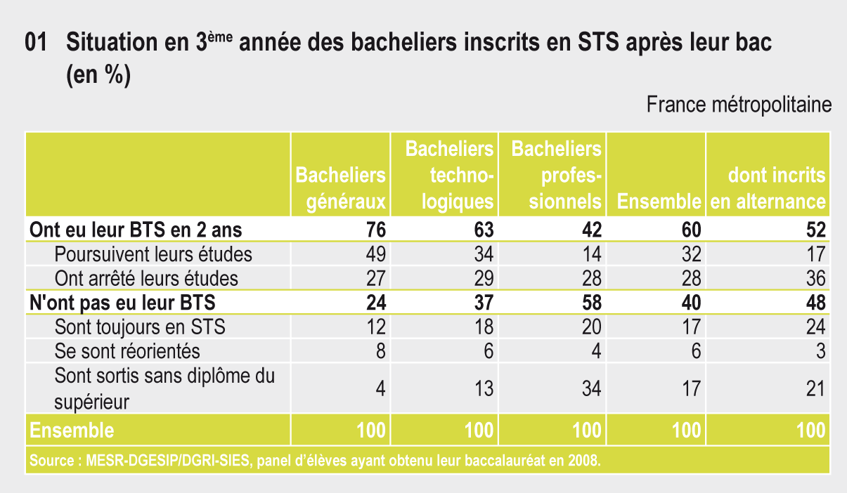 Six bacheliers 2008 sur dix inscrits en STS obtiennent leur diplôme deux ans plus tard (tableau 17.01), un peu plus que lors du précédent panel (bacheliers 2002 à 2005). Selon celui-ci, environ 10 % obtiendront le BTS en 3 ans.