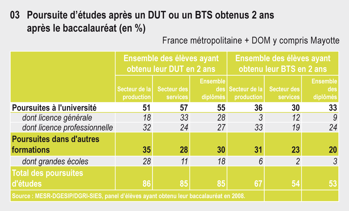 Les lauréats d’un BTS ou d’un DUT obtenu en deux ans poursuivent de plus en plus leurs études au moins jusqu’au niveau L, grâce en particulier à la création de la licence professionnelle. La très grande majorité des bacheliers qui se sont orientés en classe préparatoire scientifique ou commerciale ont rejoint une grande école deux ans plus tard alors que ceux inscrits en classes littéraires rejoignent le plus souvent l’université.