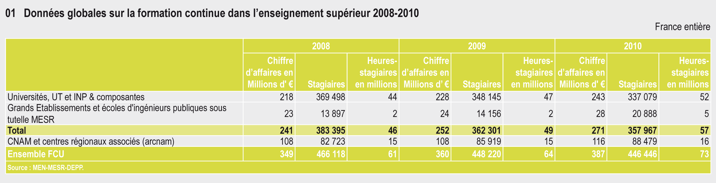 En 2011, la formation continue dans l’enseignement supérieur a réalisé un chiffre d’affaires de 411 millions d’euros en progression de 6 % par rapport à 2010. Elle représente donc 2 % du chiffre d’affaires de la formation professionnelle en France. Elle a accueilli 450 000 stagiaires, délivré 71 300 diplômes dont 48 000 diplômes nationaux [Consult the following page]