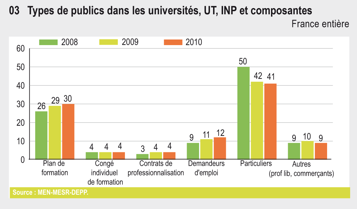 Cette fiche a été actualisée. Consultez la fiche 24. la formation continue dans l’enseignement supérieur dans L'état de l'Enseignement supérieur et de la Recherche en France n°10 - Avril 2017