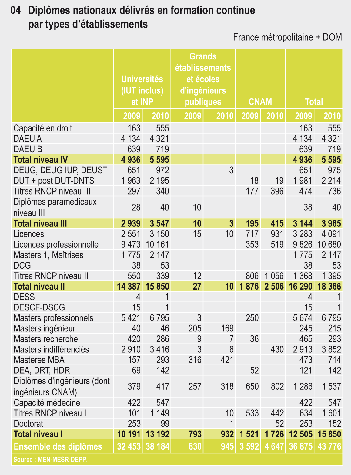 En 2010, la formation continue dans l’enseignement supérieur a accueilli 446 400 stagiaires, délivré 68 200 diplômes dont 43 700 diplômes nationaux et réalisé un chiffre d’affaires de 349 millions d’euros. Avec un peu plus de 4 000 dossiers validés en 2010, les validations des acquis de l’expérience se maintiennent.